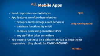 3) Popular platforms and frameworks like .NET, Xamarin, Android and iOS have adopted async APIs, allowing asynchronous programming in mobile apps across these platforms using C# and a common syntax.