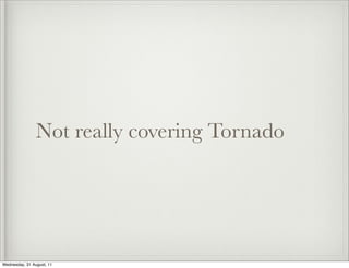 This document discusses asynchronous programming using Python. It begins with introductions and discusses some of the buzzwords around asynchronous programming like Node.js, Tornado, and event loops. It then provides a brief history of threading, multiprocessing, and asynchronous programming. It defines what an event loop is and discusses concepts like callbacks and deferreds. It notes that asynchronous code is generally harder to write and can be slower than synchronous code. However, asynchronous programming allows for greater scalability by avoiding threads and shared state.