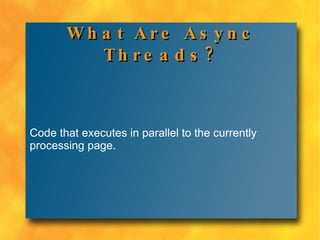 Async threads in Lasso allow code to run asynchronously and in parallel to the currently processing page. They are useful for offloading tasks to improve response times and for recurring events like scheduled jobs. Async threads do not have access to web request data and their output is not available, so alternative methods like logging must be used. Context can be passed into async threads using variables. Debugging async threads requires techniques like testing code outside the async context, trapping for errors, and sending debug messages to external sources.