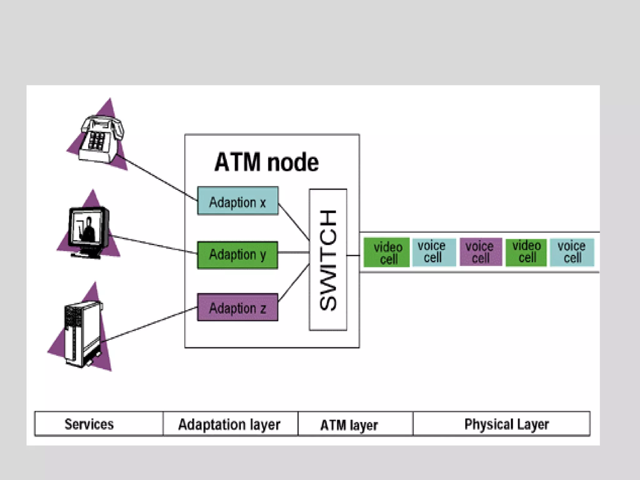 Asynchronous Transfer Mode (ATM) is a switching technique that uses fixed-sized cells to encode data for transmission over telecommunication networks. ATM can handle both traditional high-speed data traffic as well as real-time, low-latency content like voice and video. It provides services at the data link layer and has similarities to both circuit switching and packet switching. ATM is commonly used for wide area networks and some DSL implementations also use ATM technology.