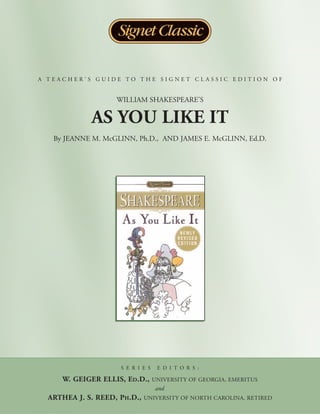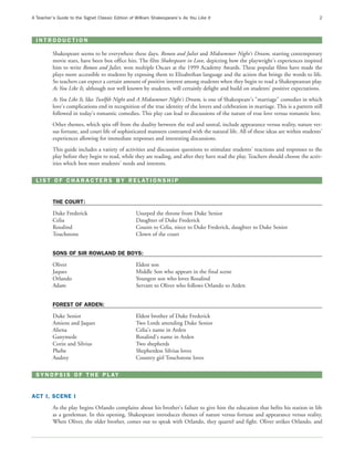 This document provides a summary and context for William Shakespeare's comedy As You Like It. It begins with an introduction noting the play's themes of nature vs fortune, appearance vs reality, and court life vs the natural life. It then provides a list of the play's characters organized by relationship. The bulk of the document is a detailed 3-act synopsis of the plot. It concludes by noting the resolution of the play's romantic plots through marriages planned for the following day.