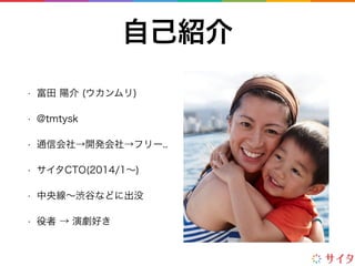 (ウカンムリ) • @tmtysk • 通信会社→開発会社→フリー.. • サイタCTO(2014/1∼) • 中央線∼渋谷などに出没 • 役者 → 演劇好き 自己紹介