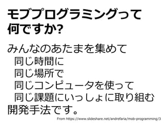 モブプログラミングって 何ですか? みんなのあたまを集めて 同じ時間に 同じ場所で 同じコンピュータを使って 同じ課題にいっしょに取り組む 開発手法です。 From https://www.slideshare.net/andrefaria/mob-programming/3