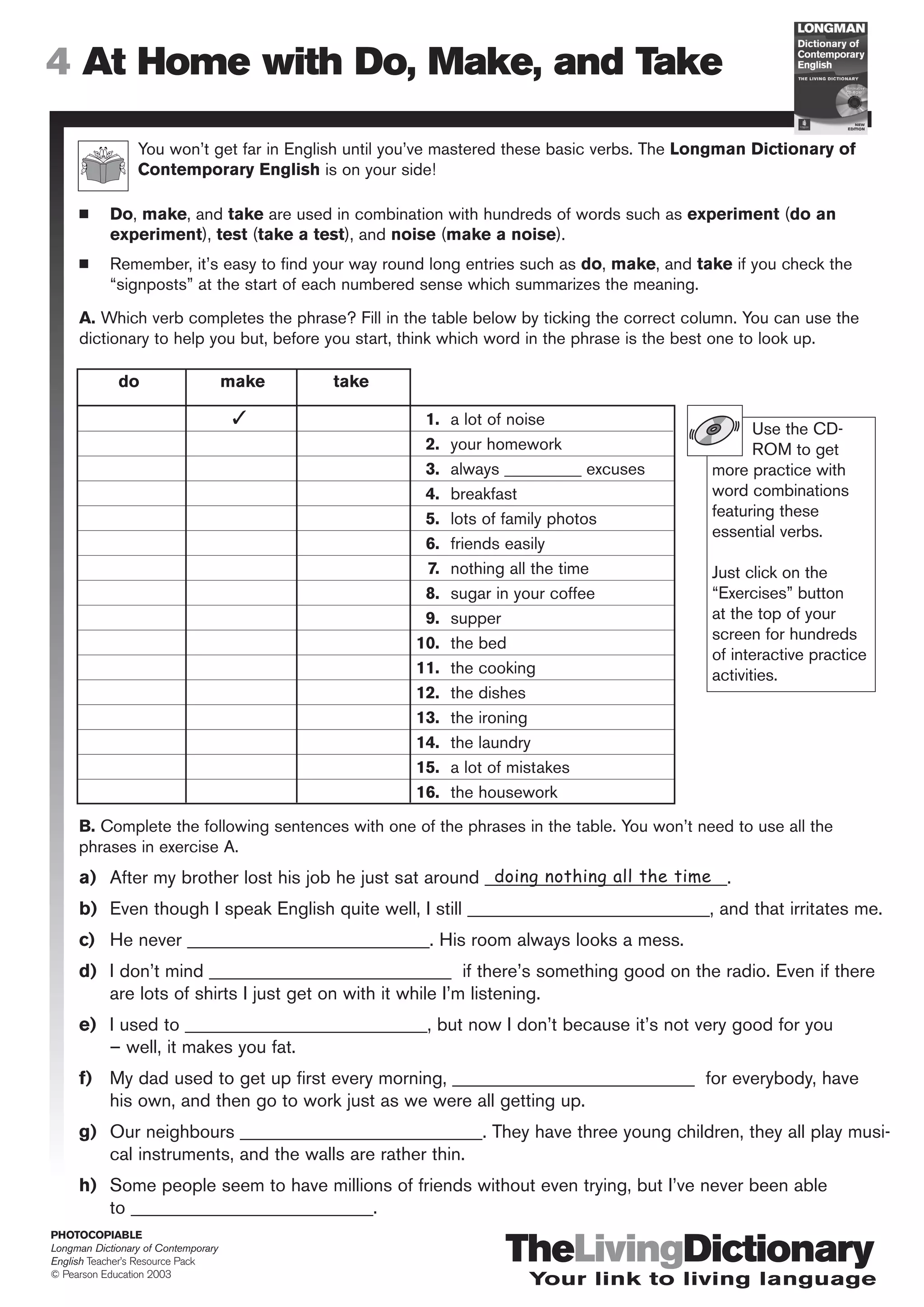 This document provides exercises to help students practice using the verbs "do", "make", and "take" in combination with other words. It includes a table for students to fill in which verb completes different phrases. Students then complete sentences with phrases from the table to reinforce word combinations with these essential verbs. The goal is to help students master common collocations and uses of "do", "make", and "take" which are important for English proficiency.