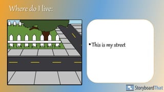 The document describes the rooms and features of the author's house, including the living room, kitchen, bedrooms, bathrooms, backyard, and garage. Each page includes a picture and brief description of a different room or area to illustrate where the author lives. The document ends by asking if the reader likes the author's house.