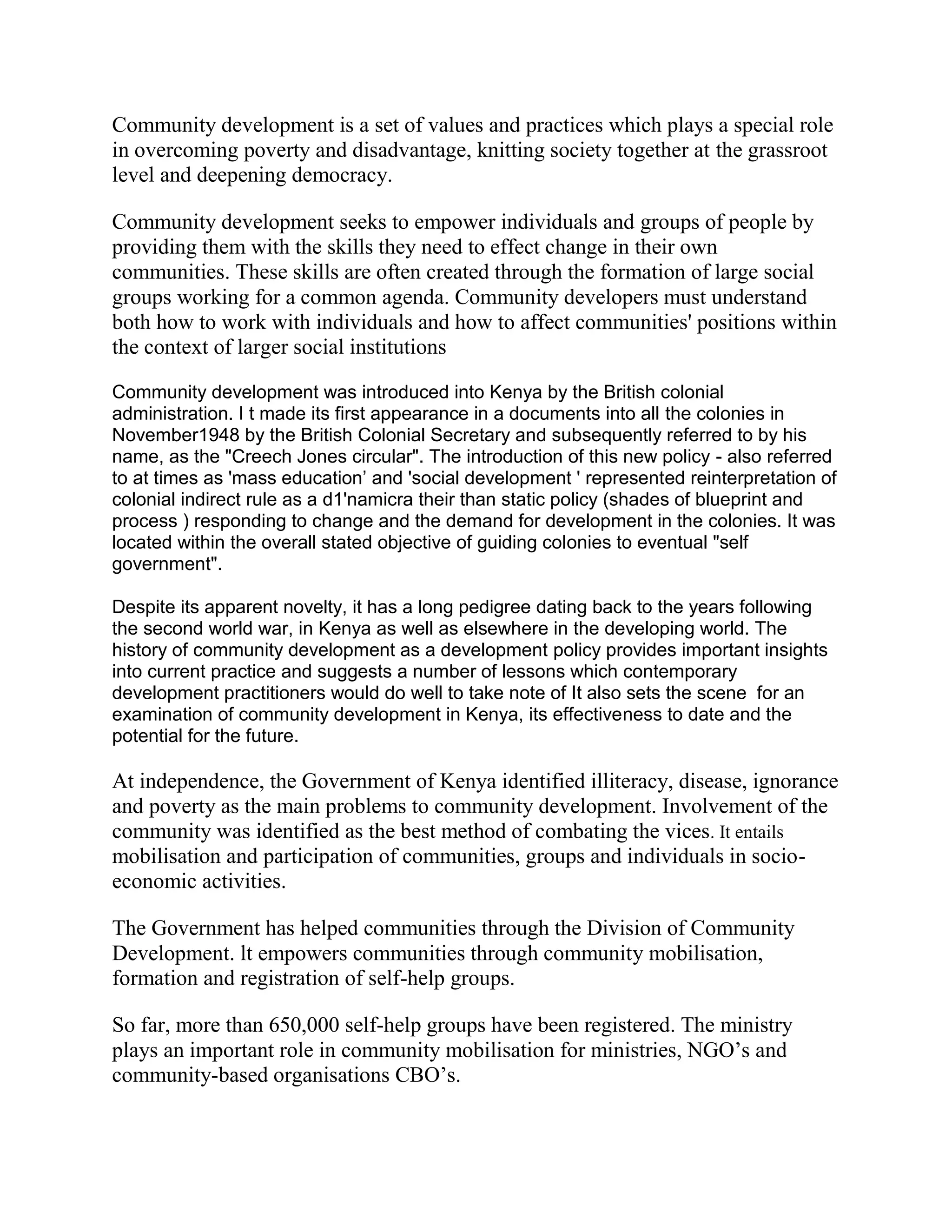 Community development began in Kenya under British colonial rule as a way to promote self-help projects and local participation, though it faced criticism for being inefficient and not truly participatory; after independence, community development supported initiatives like women's groups and the Harambee movement but declined as large donor projects rose; today, community development focuses on empowering marginalized groups and its approaches have been incorporated into various occupations.