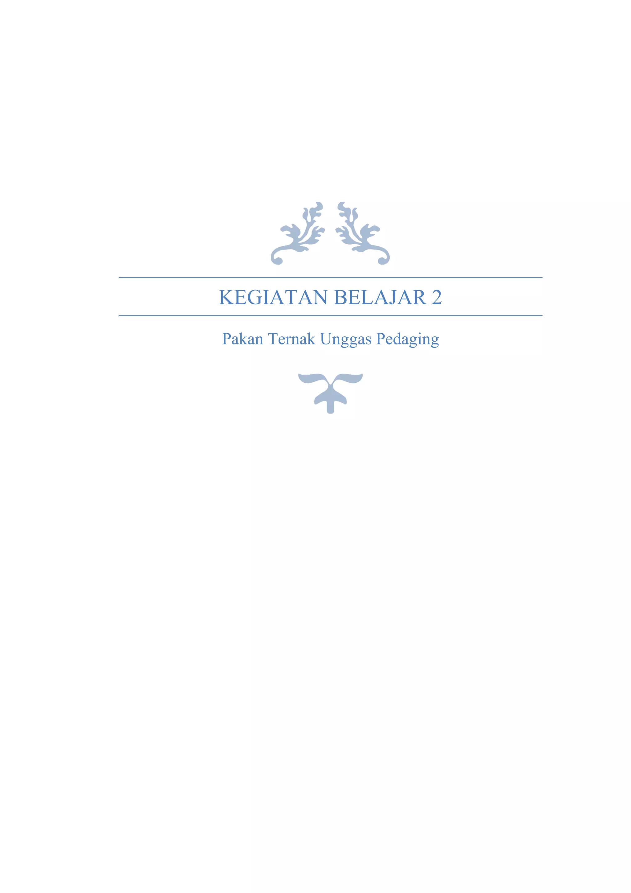 Modul ini membahas tentang pakan ternak unggas pedaging, mulai dari bahan baku pakan, spesifikasi bahan baku, persyaratan mutu pakan, kebutuhan nutrisi berdasarkan periode produksi, formulasi pakan, proses pembuatan, bentuk, pengemasan, dan transportasi pakan. Bahan baku pakan utama meliputi jagung, kedelai, bungkil kelapa, dan dedak padi. Modul ini bertujuan menjelaskan prinsip agribisnis