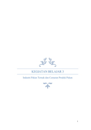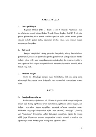 Dokumen ini membahas industri pakan ternak, khususnya proses pembuatan pakan pellet, standar keamanan produk, dan jenis cemaran yang mungkin ada. Peserta didik diharapkan mampu menganalisis berbagai aspek dalam industri pakan ternak sehingga dapat menentukan standar industri yang baik. Peningkatan permintaan pakan akibat bertambahnya jumlah penduduk menunjang perkembangan industri pakan ternak di Indonesia.