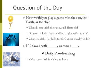 The document discusses playful interactions with nature, emphasizing the concept of recreation and leisurely activities. It gives examples of high-frequency words and illustrates the idea of ownership through singular possessive nouns. Additionally, it touches on the evolution of activities and language, including archaic terms.