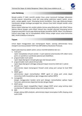 Dokumen tersebut memberikan panduan penggunaan dan konfigurasi perangkat jaringan Allied Telesys Rapier. Rapier merupakan switch yang memiliki fitur-fitur seperti VLAN, firewall, DHCP server, dan dapat dikonfigurasi melalui port serial menggunakan aplikasi HyperTerminal. Dokumen ini menjelaskan cara mereset, mengatur password, membuat file konfigurasi, serta mengonfigurasi VLAN dan interface pada perangkat Rapier.