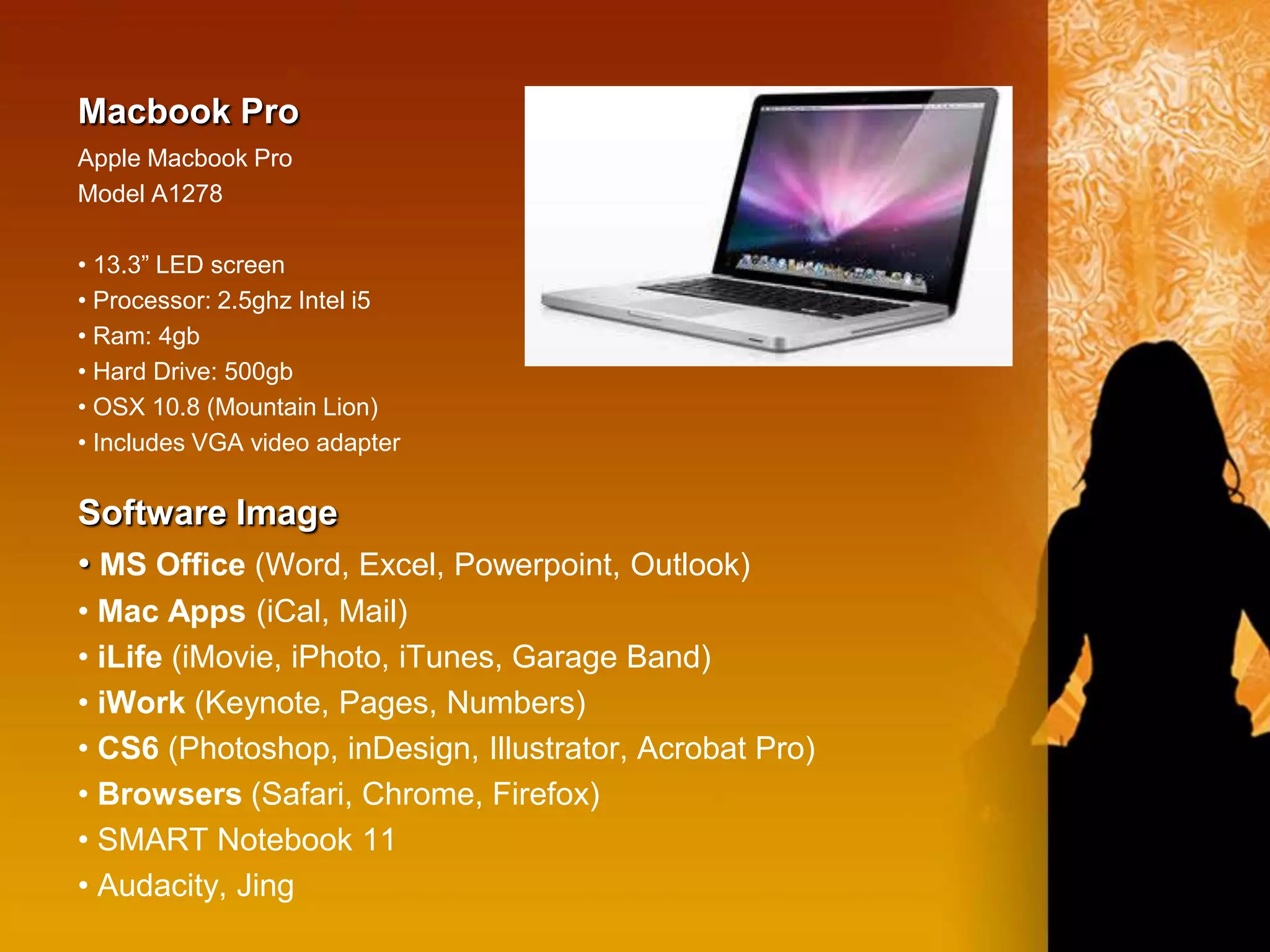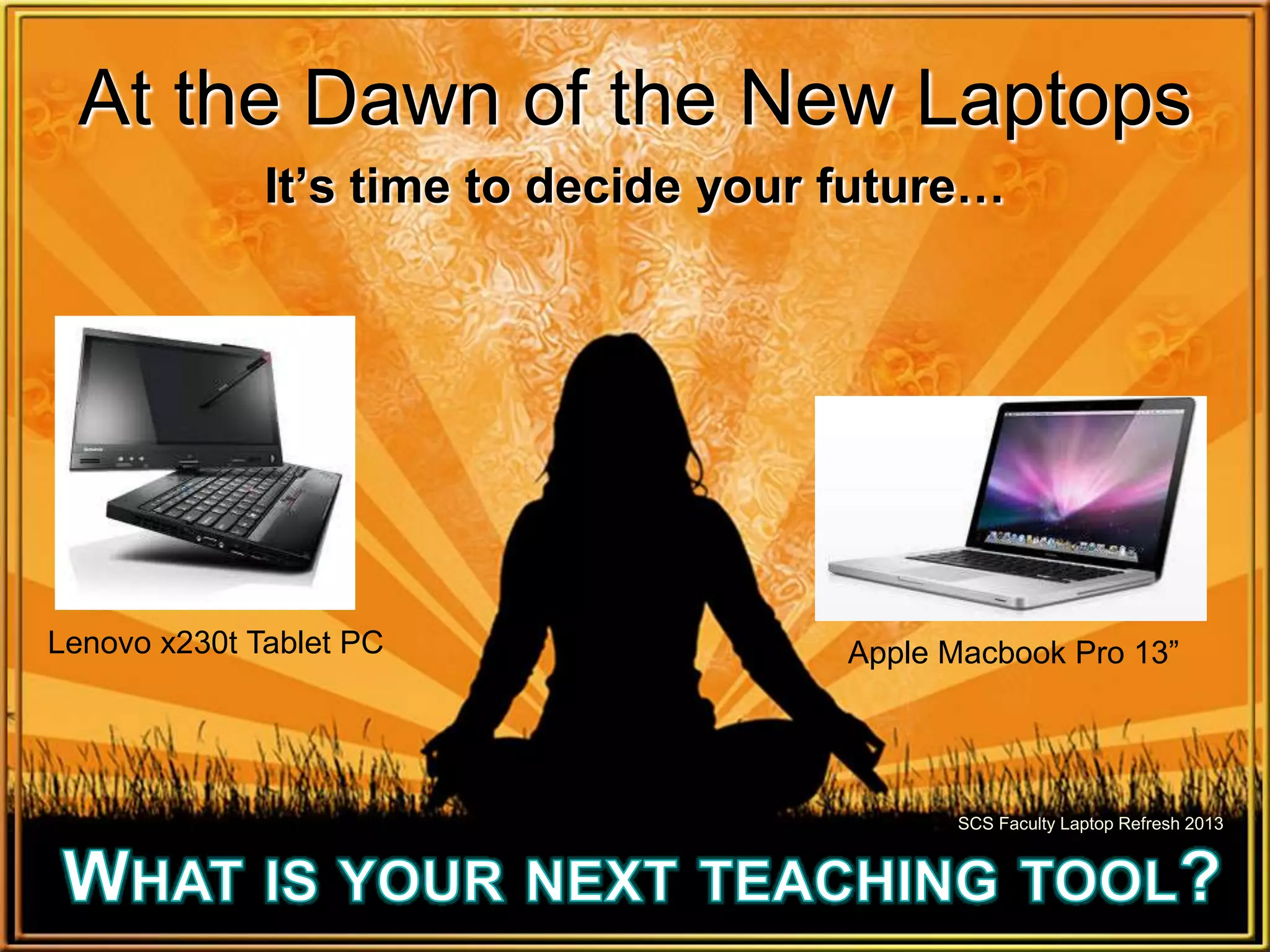 This document summarizes two laptop options, a Lenovo x230t tablet PC and an Apple Macbook Pro 13", for a faculty laptop refresh program. Both laptops have similar specifications including processors, memory, storage and battery life. They also support the same software including Microsoft Office, Adobe Creative Cloud, browsers and SMART Notebook. The key differences are that the Lenovo has a reversible touchscreen that folds into a tablet, includes Microsoft OneNote, and receives updates from IT, while the Macbook Pro has a built-in DVD drive, includes Apple's iLife suite and iWork, and requires the user to install updates. The document invites the reader to click a link to select their preferred laptop option.