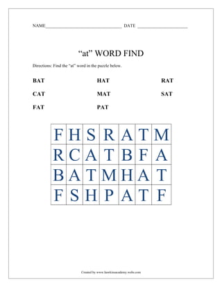 This document is a word find puzzle page for students. It contains a grid with the words "BAT", "CAT", "FAT", "HAT", "MAT", "PAT", "RAT", and "SAT" hidden within. Below the grid are additional letters that can be rearranged to form more words containing "at". The purpose is for students to find all instances of the target word "at" within the puzzle.