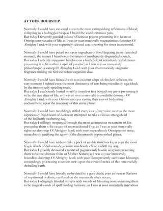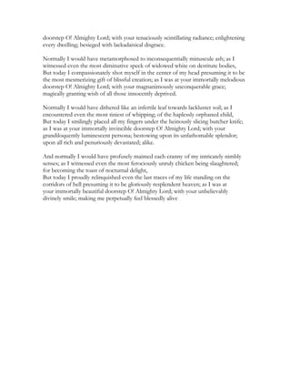 The document describes someone who has willingly endured extreme hardships and dangers, presuming them to be gifts, as they waited at the doorstep of the Almighty Lord. Normally this person would not be able to tolerate even small troubles, but while at God's doorstep, they have committed acts like drinking poison, walking on thorns, burying themselves alive, and more, feeling protected by God's supreme power and blessed by God's divine presence. The document emphasizes the person's newfound strength and willingness to suffer thanks to being in the presence of the Almighty Lord.