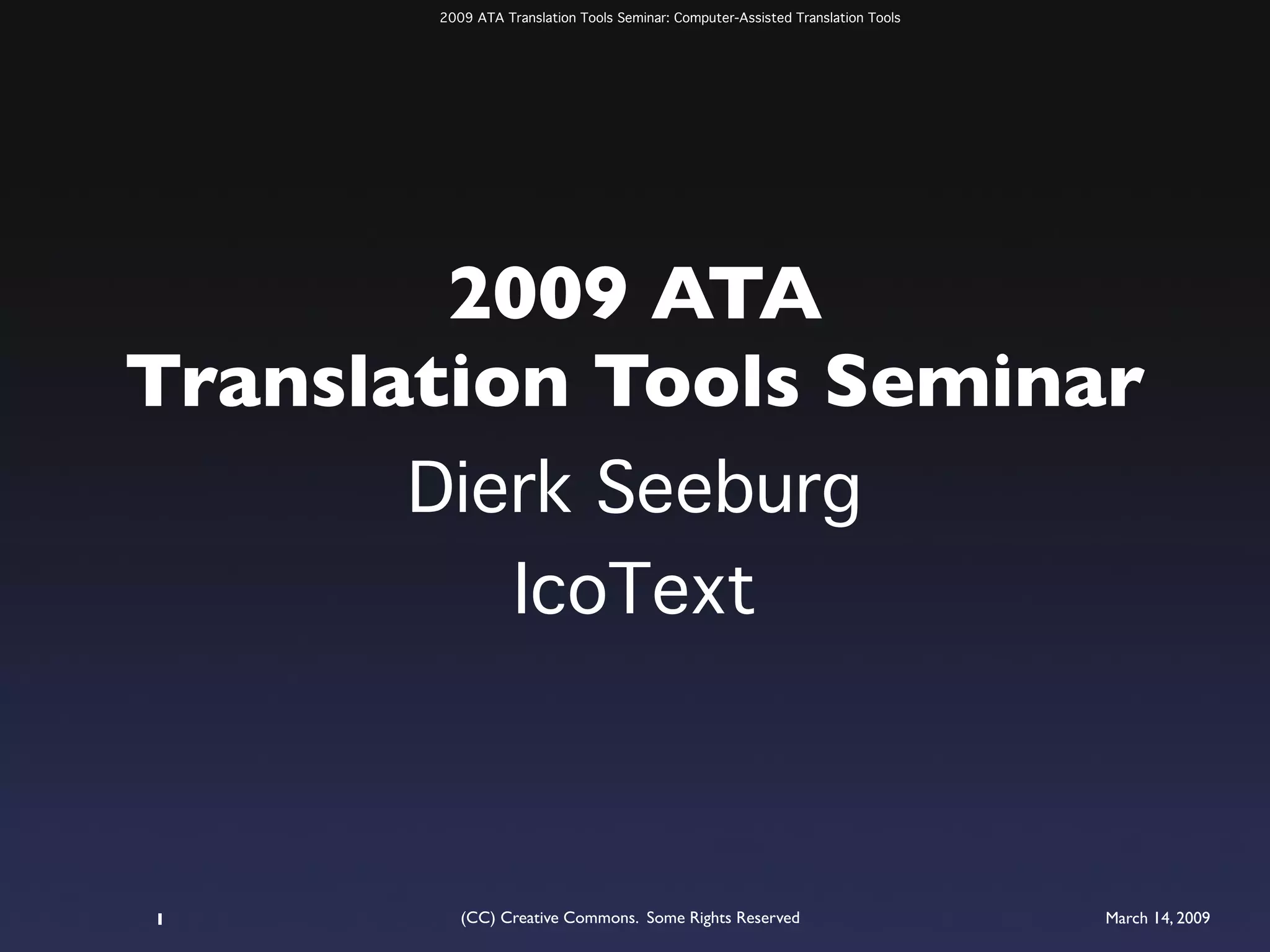 The document discusses the 2009 ATA Translation Tools Seminar, which focuses on computer-assisted translation tools and their evolution from basic term extraction to integrated translation environments. It covers various aspects such as the history of translation memory technology, the challenges faced by translators in adopting these tools, and includes surveys related to the experiences of translators with these technologies. Additionally, it introduces different categories and examples of computer-assisted translation tools available at the time.