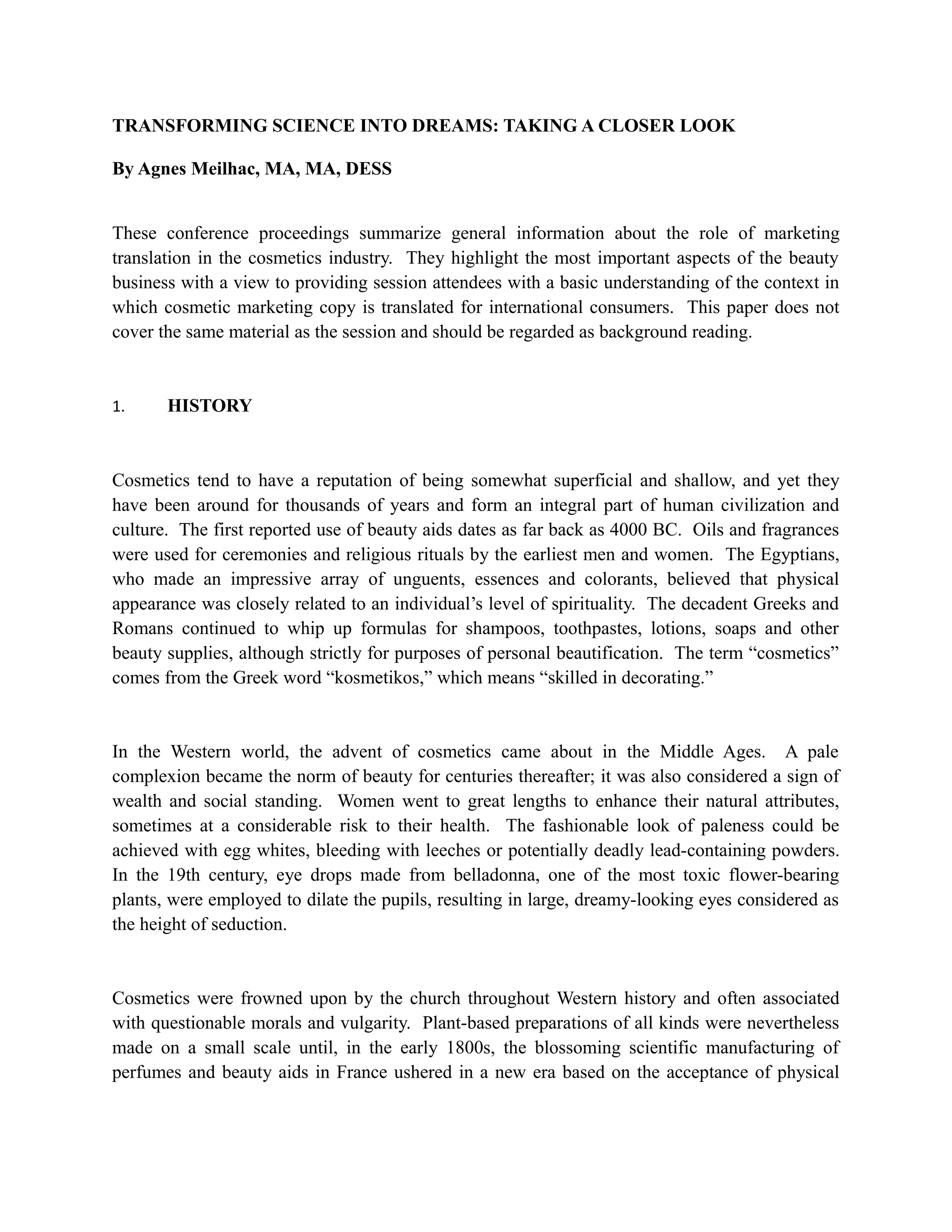 This document provides background information on the cosmetics industry and marketing translation. It discusses the history of cosmetics use dating back 4000 BC and how the industry developed over centuries. Today, cosmetics is a multi-billion dollar global industry dominated by large international corporations. Innovation, research/development, and heavy advertising are key drivers of the industry. The language used in cosmetics marketing borrows scientific terms and creates new words to describe products and their benefits.