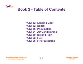 This document provides information on the landing gear systems for the Airbus A300 and A310 aircraft. It includes sections on landing gear controls and indications, hydraulic and electrical power sources, and details on the nose, main and tail landing gears. Tables provide general characteristics such as gear dimensions and weights. Diagrams show the landing gear arrangement and components. The document appears to be an aircraft technical manual intended for training purposes.