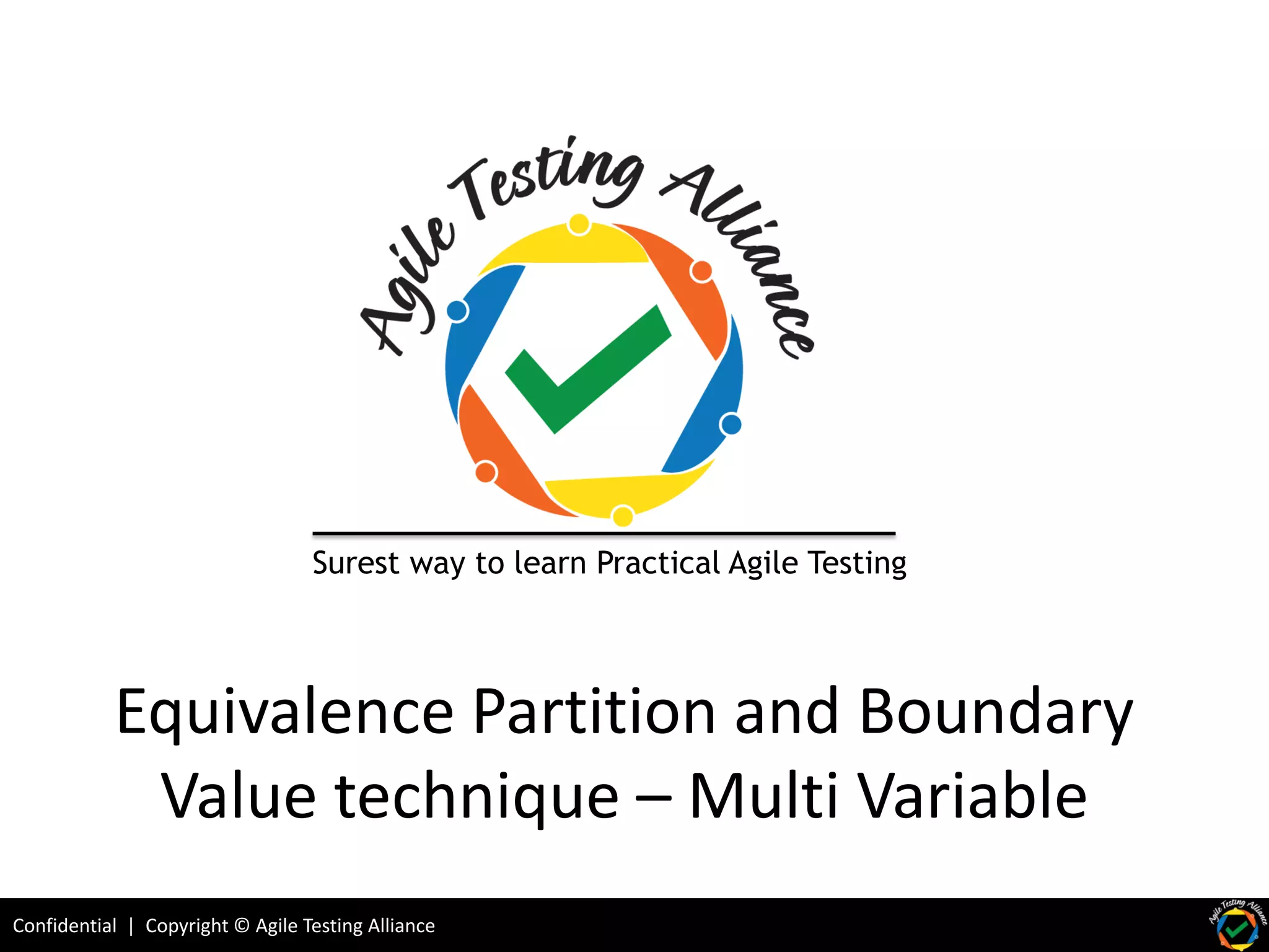 The document outlines concepts in agile testing, specifically the equivalence partitioning and boundary value analysis techniques used to improve software testing efficiency. It highlights the importance of partitioning input domains into equivalence classes to select test inputs while also analyzing potential faults near boundaries. The document includes examples of creating equivalence classes and designing test cases in the context of a loan application software.
