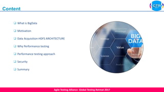 The document discusses the importance of performance testing in big data applications, highlighting the need for specific testing approaches due to massive data volumes. It outlines data acquisition through HDFS architecture and emphasizes security measures such as the implementation of Kerberos for user authentication. A case study of a U.S. insurer illustrates the practical application of these concepts to improve data handling and application performance.