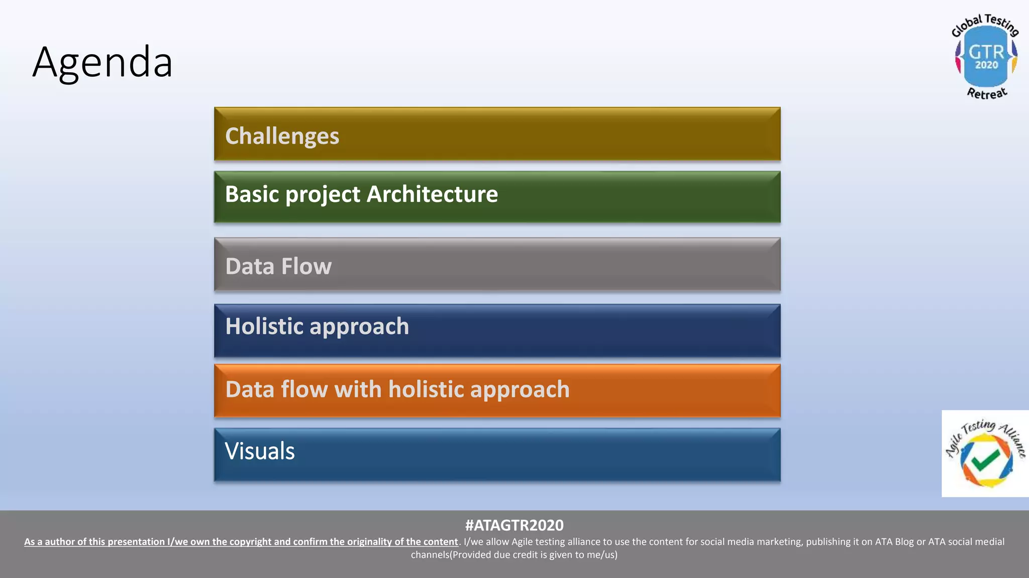This document presents a holistic approach to IoT testing, emphasizing the importance of data flow and architecture in the testing process. It identifies challenges related to data and metadata, skillsets, and processes, while suggesting methods for effective testing through various phases of data management. The authors, Dhananjay Buva and Pradnya Patil, confirm their copyright ownership and permit the Agile Testing Alliance to use their content for marketing purposes.