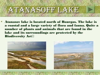 The document discusses the Atanasov Lake and Bourgas Lake in Bulgaria, highlighting their rich biodiversity, particularly in avian species. Atanasov Lake is home to numerous protected flora and fauna, including endangered birds like the Dalmatian pelican and red-breasted goose, while Bourgas Lake, the largest natural lake in Bulgaria, is affected by pollution and supports many migratory birds. Significant conservation efforts are noted, with several species listed in Bulgaria's red book.