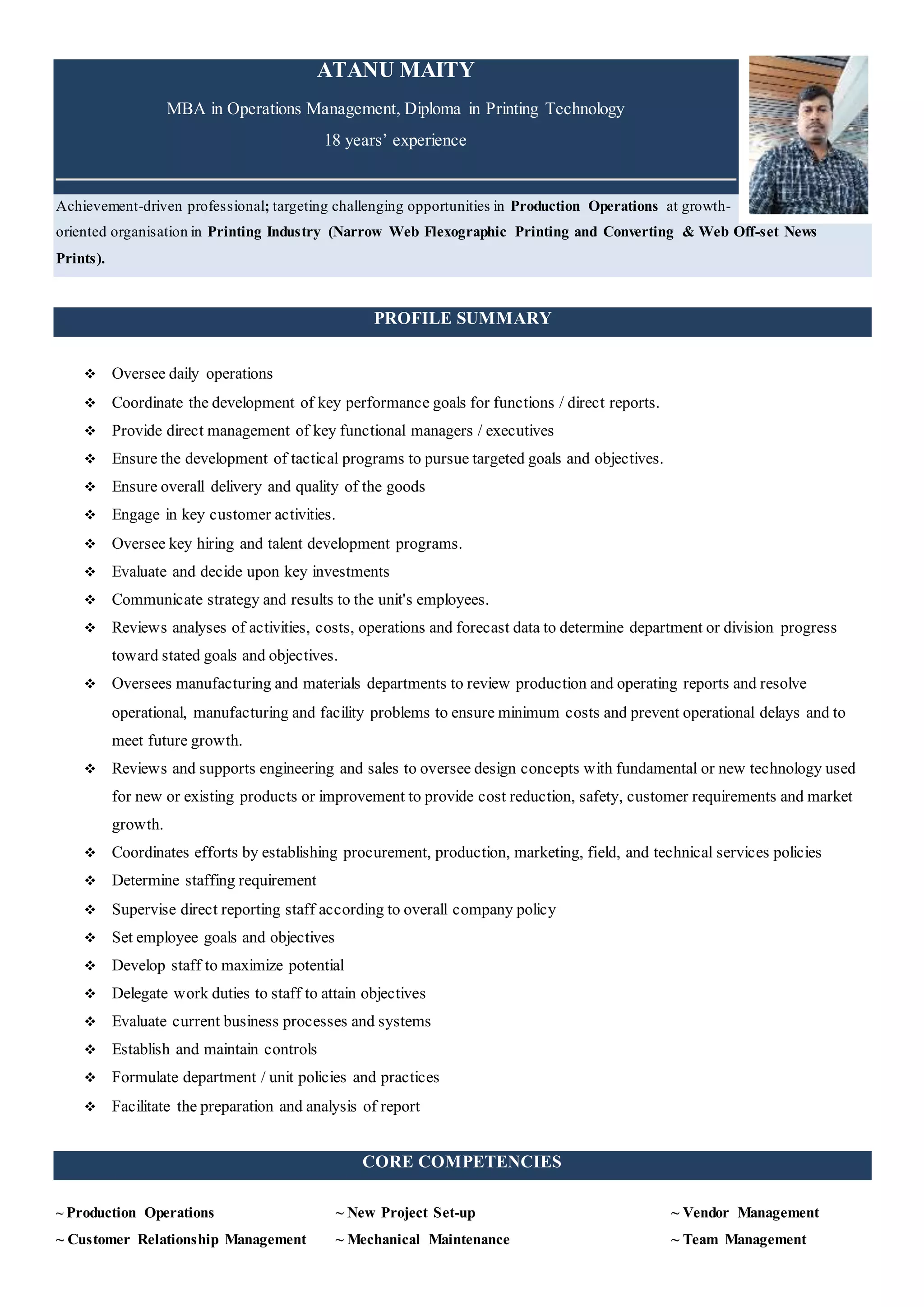 Atanu Maity is an experienced factory manager with an MBA in operations management and 18 years in the printing industry, focusing on production operations and team management. He has led various functions, developed performance goals, and ensured delivery and quality of goods while managing talent and investments. Holding positions in reputable companies across India and Bangladesh, he combines technical expertise with effective management strategies.