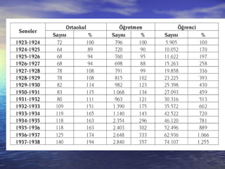 Özellikle kadın öğretmensayısındaki %352’lik artış ile kız öğrencilerdeki %323’lük ortaokullardaki öğrencilerde %1.255 ve liselerdeki öğrenci sayısındaki %1.692’lik artış dikkat çekici olmuştur. Diğer taraftan yeni açılan ilkokul sayısı %137, ortaokul sayısı %194 ve lise sayısı %296’lık bir artış göstermiştir. Cumhuriyet’in ilk yıllarında yüksek öğretimde hiçbir kadın öğretim üyesi olmamasına rağmen, 1938 yılında üniversitelerde 99 kadın öğretim üyesi bulunmaktadır. Ayrıca %189’luk bir artış gösteren bu kurumlardaki öğrenci sayısı da %328 artmıştır
