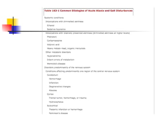 Ataxia and Vertigo can be caused by disorders of the peripheral or central nervous system. Peripheral causes include benign paroxysmal positional vertigo (BPPV), Meniere's disease, and vestibular neuronitis. BPPV is treated with particle repositioning maneuvers like the Epley maneuver. Meniere's disease causes episodes of vertigo, hearing loss, and tinnitus. Vestibular neuronitis causes sudden, intense vertigo that lasts for days. Central causes of ataxia and vertigo include lesions in the cerebellum or brainstem. Physical exams can help distinguish peripheral from central etiologies.