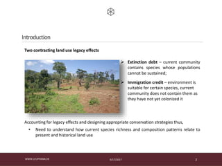 The study investigates land use legacy effects on woody vegetation in southwestern Ethiopia, focusing on how historical and present-day land use impacts species composition, distribution, and richness. Key findings indicate that while immigration credit influences current species richness, the potential extinction debt for forest specialists in farmland is being mitigated by past clearing practices. The research emphasizes the importance of recognizing biodiversity within agricultural mosaics and suggests priorities for conservation strategies that include reintroducing forest specialists.