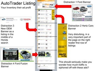 The document compares vehicle listings and vehicle detail pages (VDPs) on AutoTrader, Cars.com, and eBay. It finds that AutoTrader and Cars.com listings contain multiple distracting banners not related to the vehicle search, while eBay listings contain few or no distractions. The eBay VDP provides many high-quality photos with no banners, customizable dealer information sections, and clear terms, making it superior to the AutoTrader and Cars.com VDPs which are cluttered with dealer and other company branding.