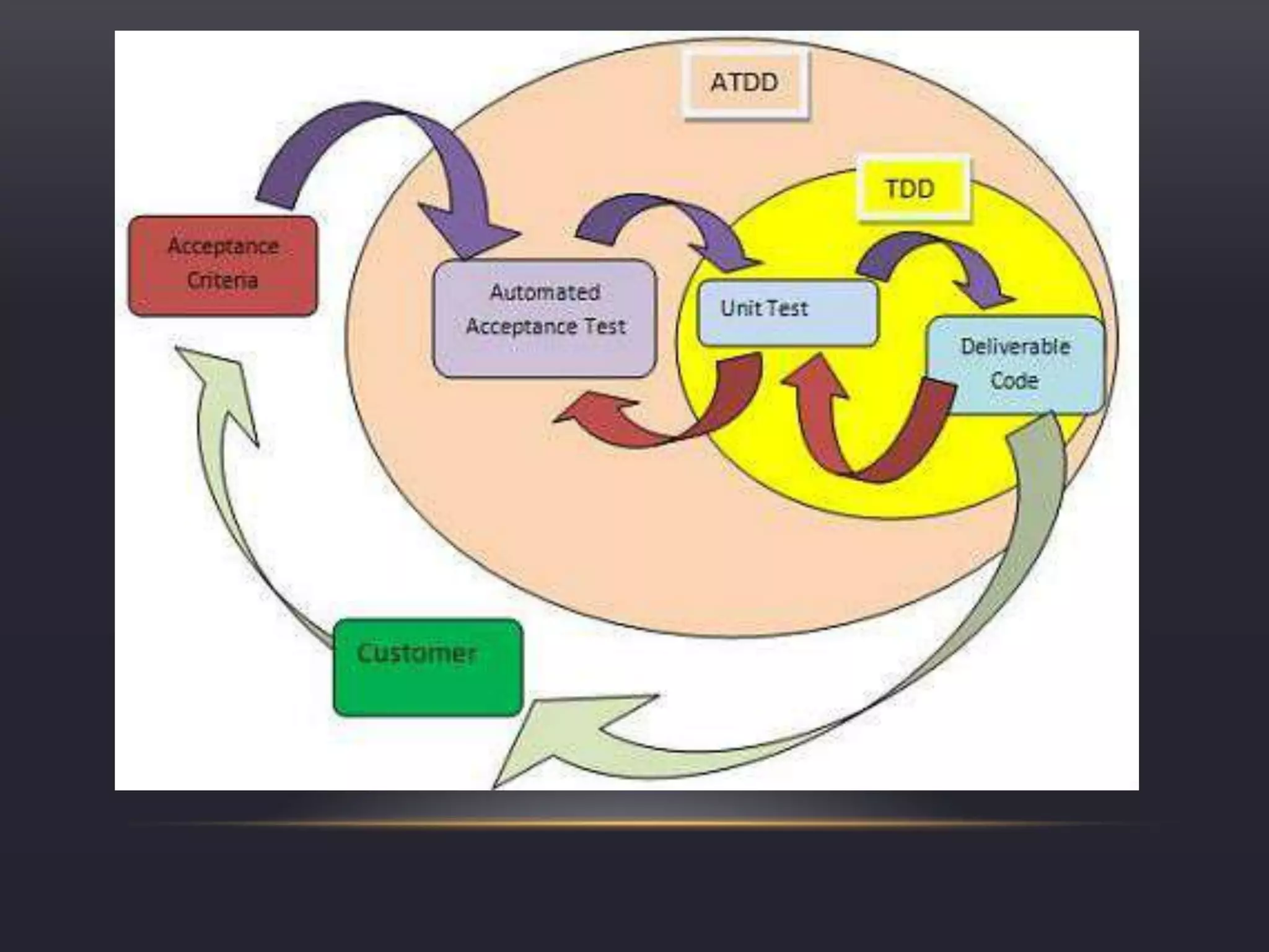 This document discusses Acceptance Test Driven Development (ATDD), Behavior Driven Development (BDD), and Test Driven Development (TDD). ATDD uses automated acceptance tests defined early in development to ensure all stakeholders understand requirements. BDD uses a Given/When/Then framework to define automated acceptance tests that assert system functionality. SpecFlow is a tool that allows testers, analysts, and developers to collaborate on BDD feature files and step definitions. TDD involves writing automated tests before code to improve quality and support refactoring through the "Red-Green-Refactor" cycle. The document demonstrates SpecFlow with an example of a movie ticketing system.