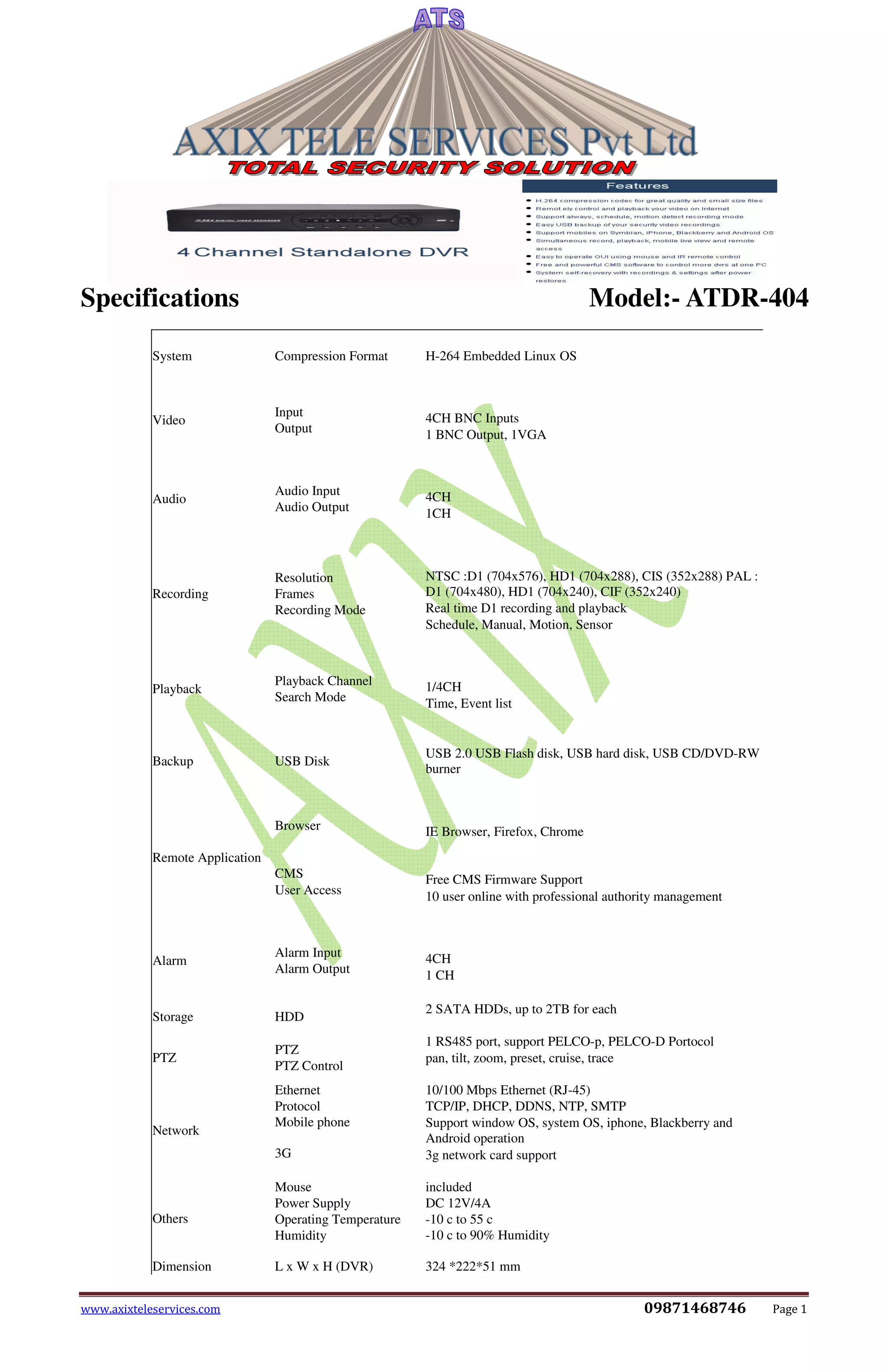 This document provides specifications for an ATDR-404 security camera system. It has 4 channel video inputs and 1 channel video output. It supports H.264 video compression and embedded Linux OS. It can record in D1, HD1, and CIF resolutions from the 4 video inputs in real time to 2 SATA hard drives with up to 2TB storage each. It also supports features such as schedule and motion detection recording, playback, backup to USB drives, remote access via browser or mobile apps, PTZ camera control, and alarm inputs and outputs.
