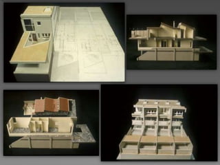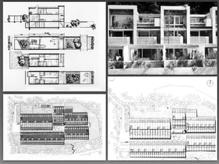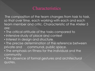 Atelier 5 was an architectural firm founded in Bern, Switzerland in 1955 by five architects. They are renowned for designing the Halen housing development between 1955-1962, which is considered a seminal example of post-World War 2 housing. Atelier 5 was influenced by Le Corbusier and focused on designing affordable concrete housing with an emphasis on private and communal spaces. They designed several other housing developments in Switzerland employing rigorous study of place and context without architectural quotes.