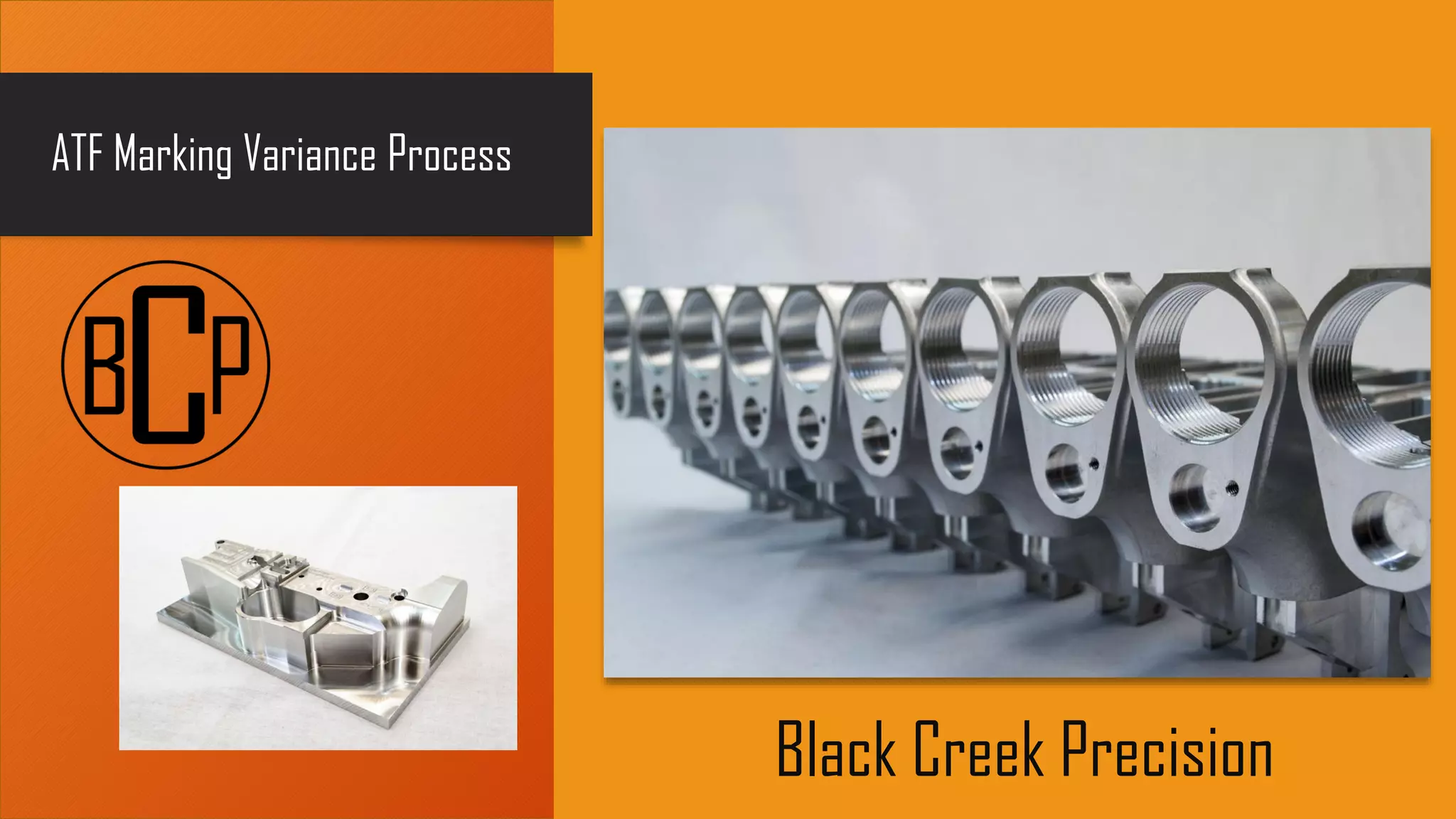 Black Creek Precision manufactures lower receivers for AR-15, .308, and other firearms. They offer a variance process that allows small businesses to have their name and logo engraved on lower receivers in minimum lots of 25 pieces. The variance process involves completing paperwork, submitting it to the ATF for approval, and pre-production work including logo proofs. Once the variance is approved, the order can be placed and engraving and manufacturing will begin within 6-8 weeks. This process allows small gun shops to build their own brand by having custom engraved lower receivers.