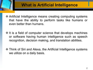 The document discusses artificial intelligence and its applications in marketing. It defines AI as systems that perform human-like tasks through machine learning. The document outlines how AI can automate tasks, improve accuracy, and generate personalized recommendations. It provides examples of AI applications in areas like machine translation, facial recognition, and virtual assistants. The document also discusses advantages of AI for marketers like faster data analysis, more accurate insights, and greater efficiency. However, it notes AI still lacks human-level creativity.