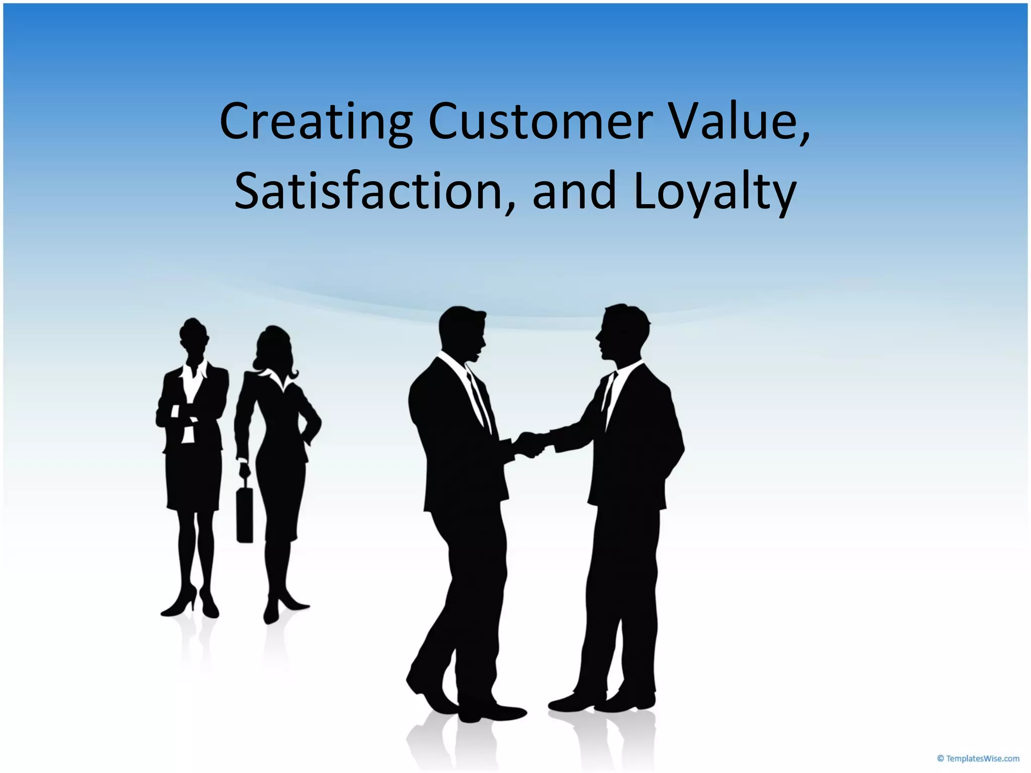 This document discusses strategies for creating customer value, satisfaction, and loyalty. It outlines methods for monitoring satisfaction through surveys, interviews, and competitor analysis. It also emphasizes making it easy for customers to complain and addressing complaints quickly. Additionally, it discusses the importance of quality and profitability analysis, attracting and retaining high-value customers through lifetime value analysis, and building loyalty through customer relationship management and databases. However, it notes that CRM requires a large investment and that most firms see little improvement if not implemented properly.