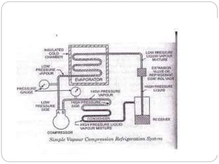 This document provides an overview of a vapor compression refrigeration system. It defines what a vapor compression refrigeration system is, why it is needed compared to other refrigeration cycles, and describes the basic mechanism and components. The key components discussed are the compressor, condenser, expansion device, and evaporator. It also covers factors that affect the coefficient of performance and provides some advantages and disadvantages.