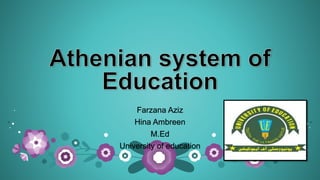 This document summarizes the education system in ancient Athens. It describes that education began at home from birth and continued until age 20. Formal schooling started at age 7, though was not compulsory. The education consisted of three courses - letters, music, and physical education. When youths turned 16, more advanced subjects like philosophy could be studied. From 18, youths took an oath and underwent two years of military service and academic training as Ephebes. Poorer children sometimes received vocational training instead of formal schooling. The overall aim was to cultivate mental, physical and moral qualities in citizens to make them strong and useful to Athens.