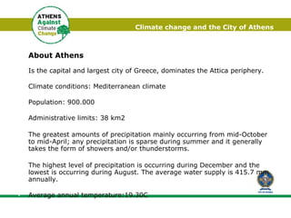 The document outlines the City of Athens' strategic plan to address climate change through 2030. It discusses challenges related to buildings, energy, lighting, renewables, transport, waste, water and green areas. The plan identifies 29 specific actions to meet goals of reducing emissions, improving energy efficiency and increasing sustainable practices in each of these sectors. The city recognizes the serious effects of climate change and aims to lead through direct management and collaboration on implementation.