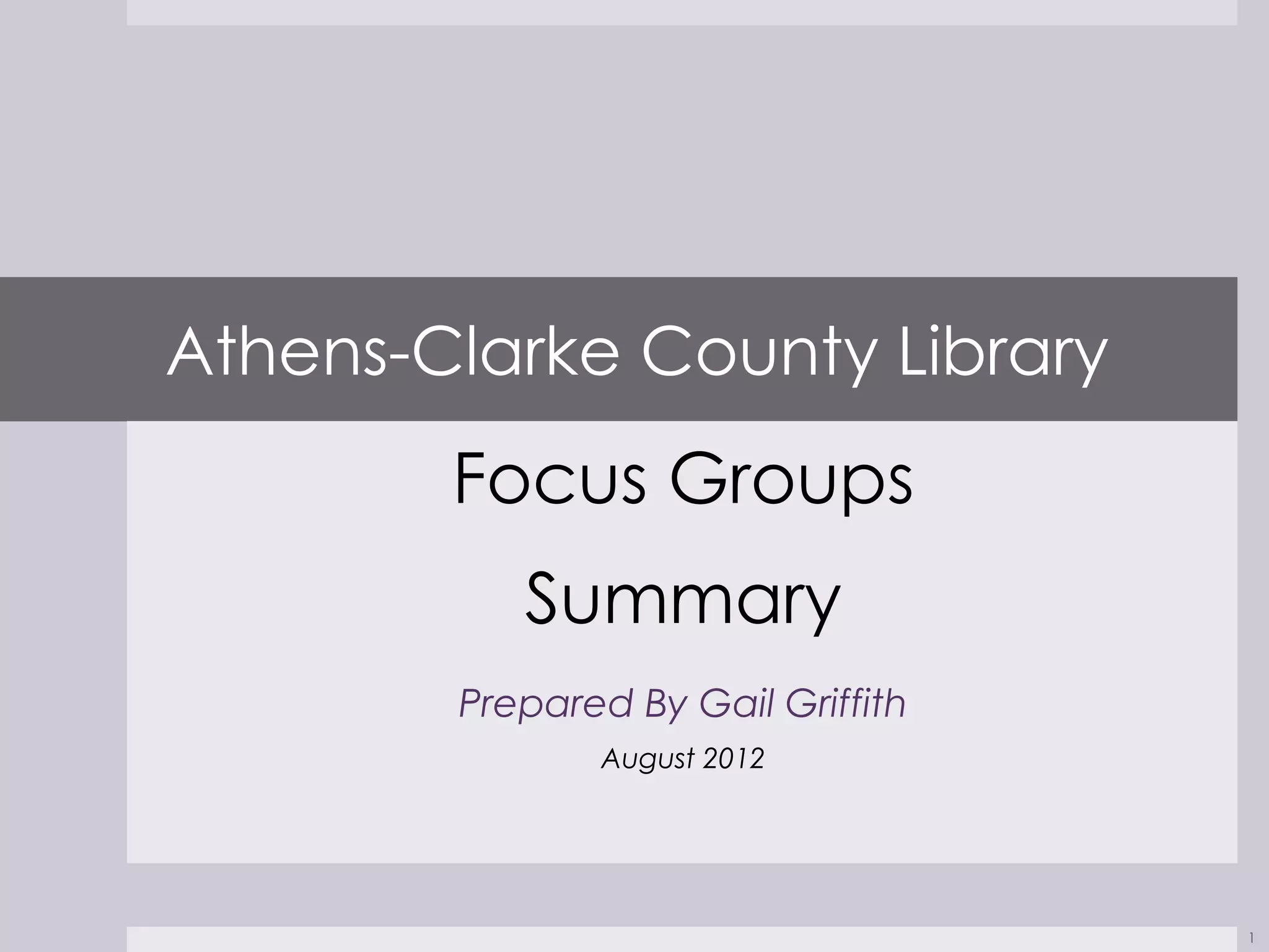 1) Focus groups were conducted with teens, parents of young children, baby boomers, and adult patrons to provide input for the Athens-Clarke County Library's strategic plan.