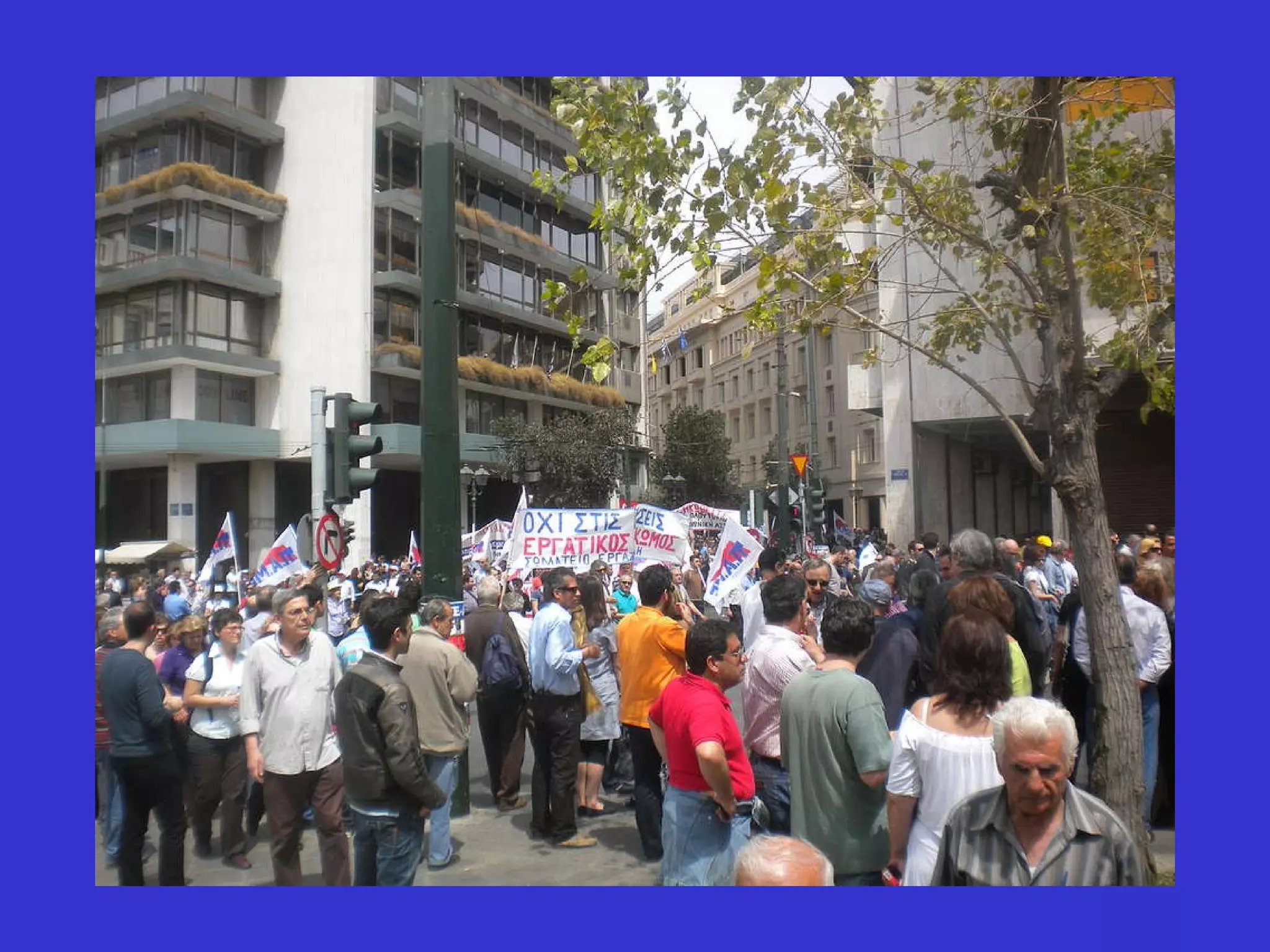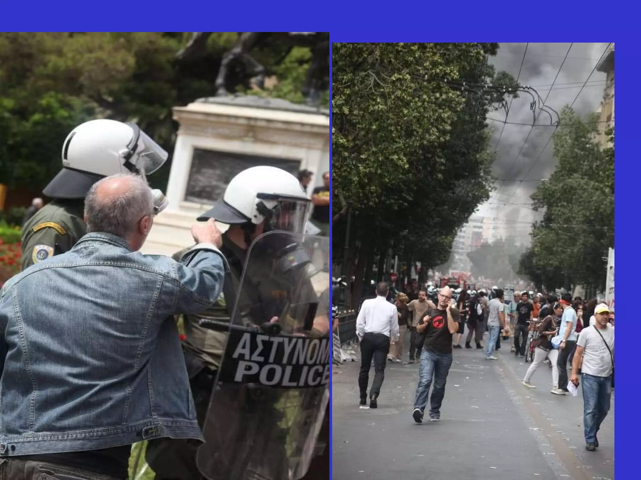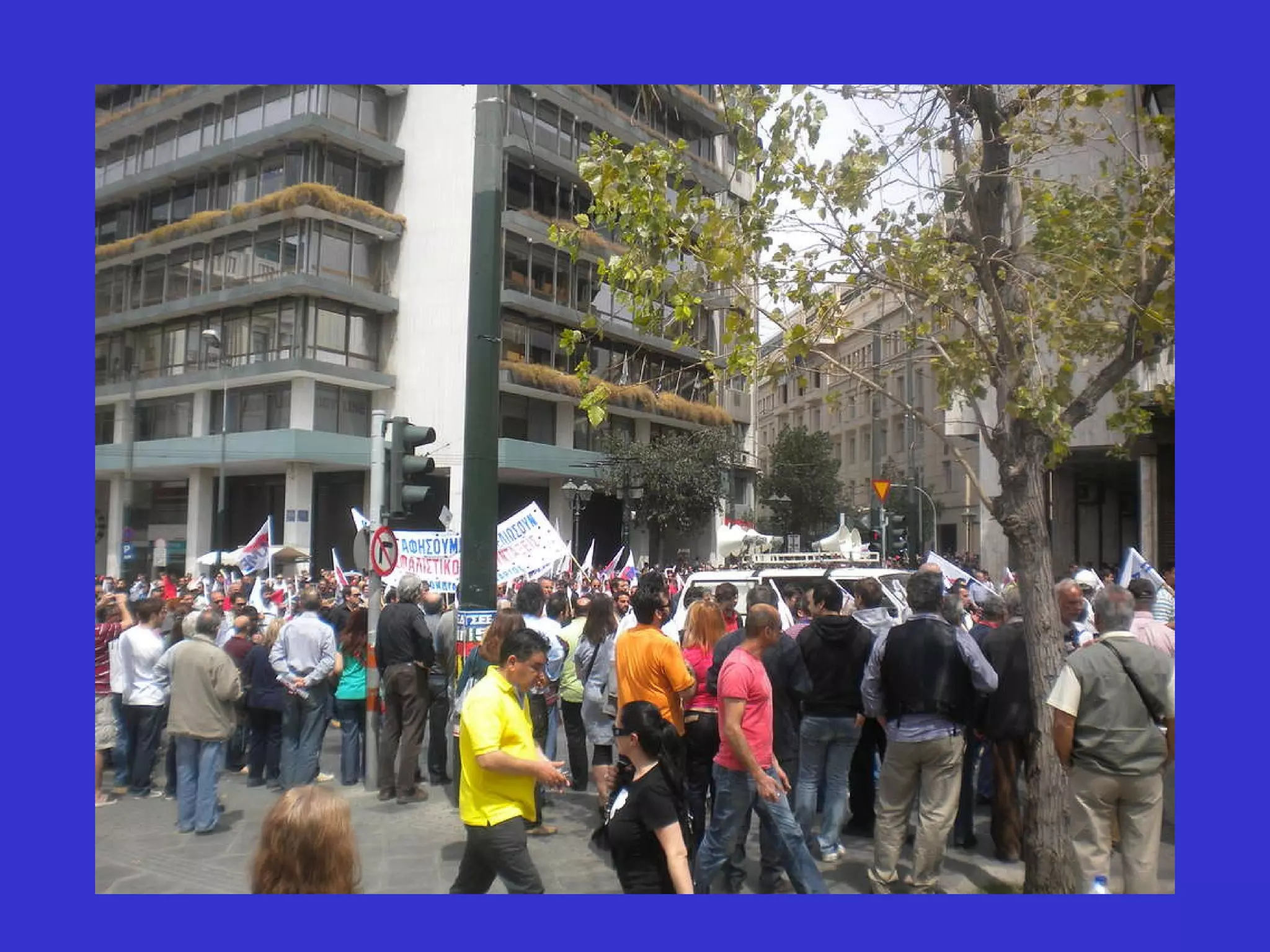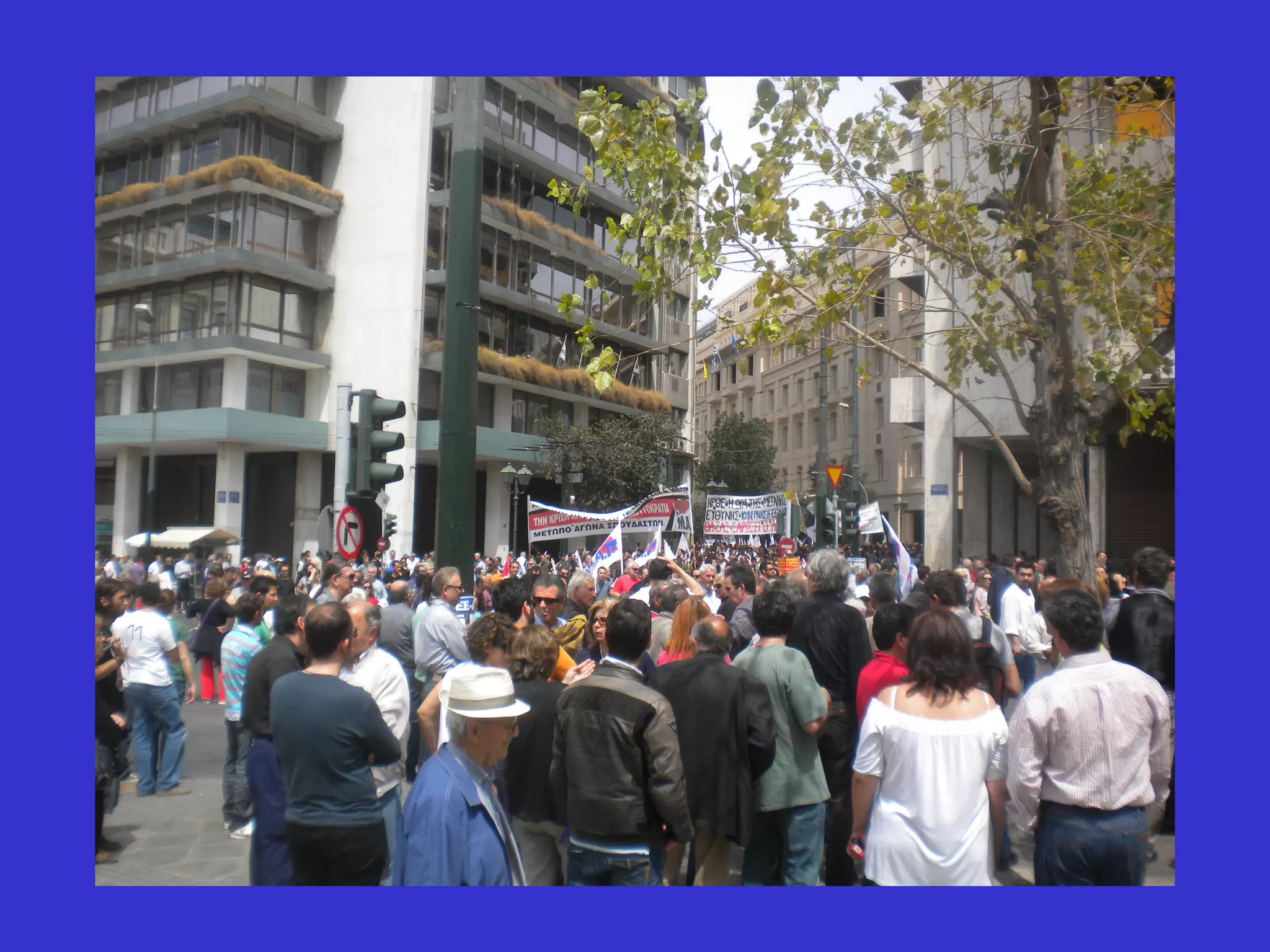 In May 2010, protests in Athens drew 200,000 participants, resulting in the tragic deaths of three workers in a fire at Marfin Bank amid demonstrations against government austerity measures. The ongoing protests reflect deep-seated discontent with capitalism in Greece. The document includes photos from the events.