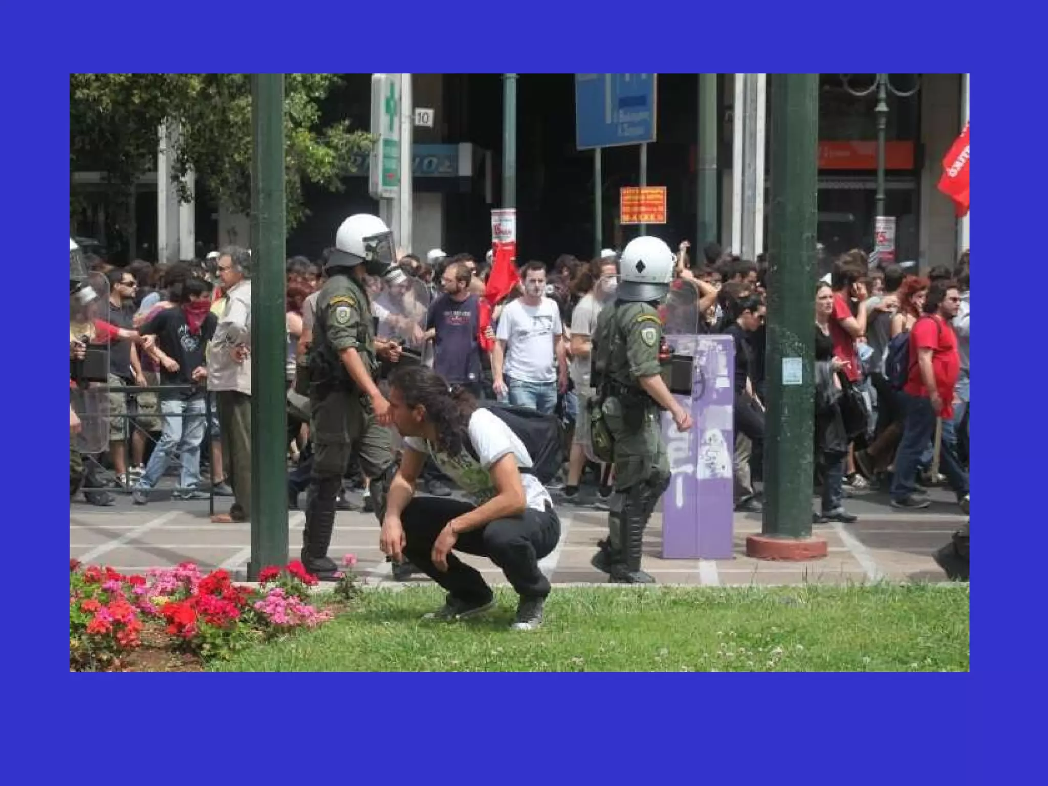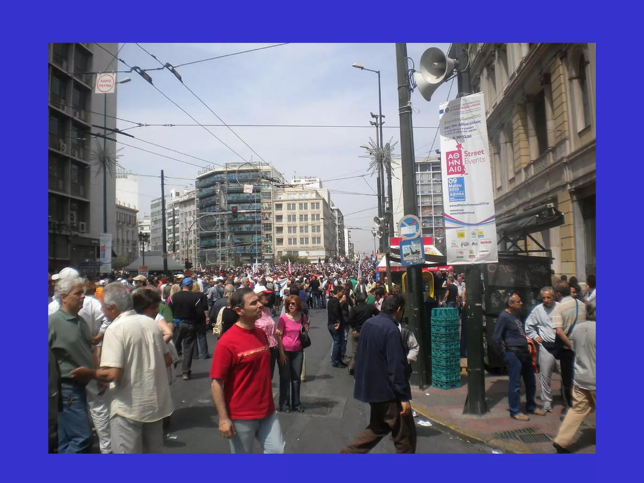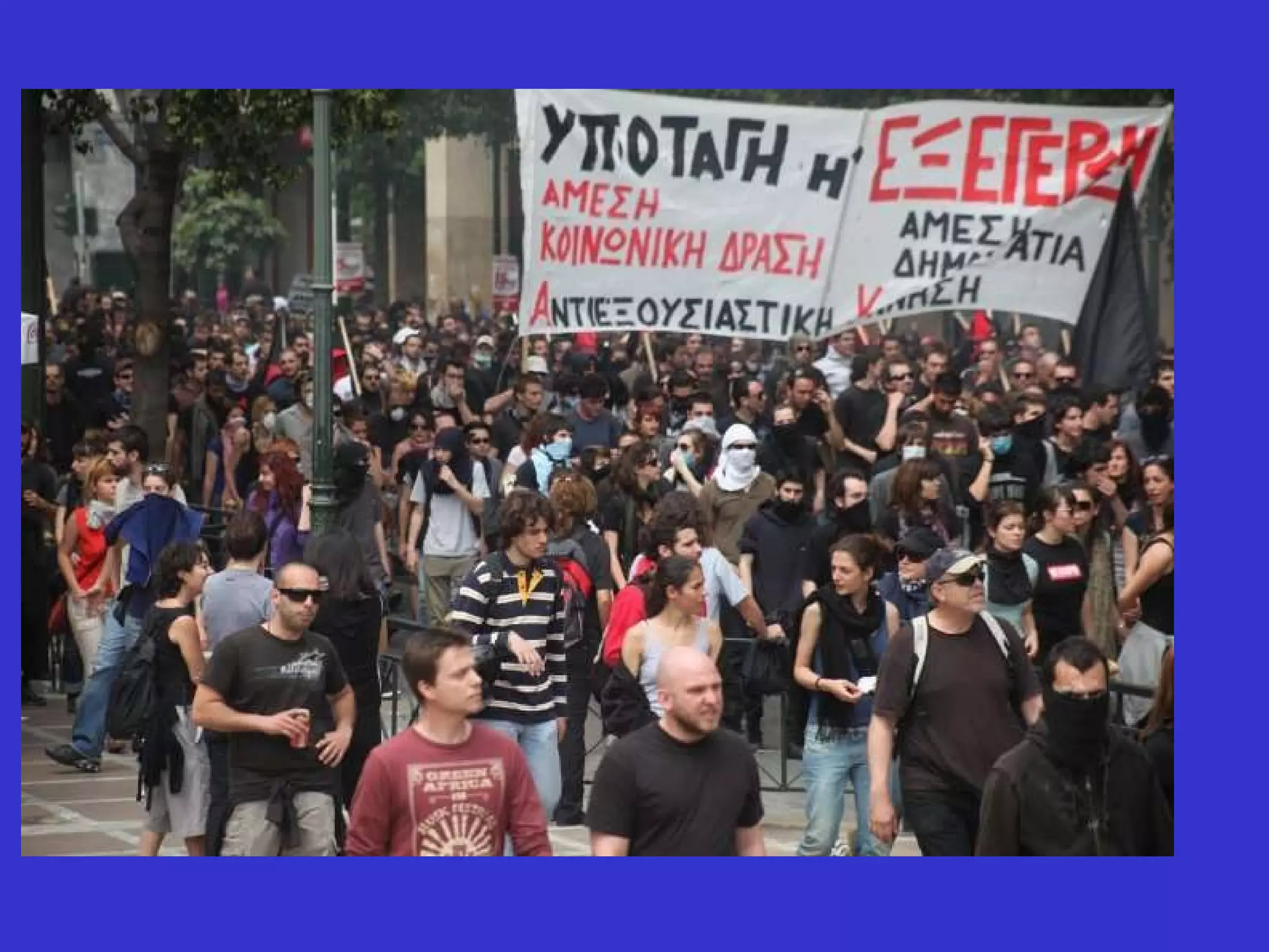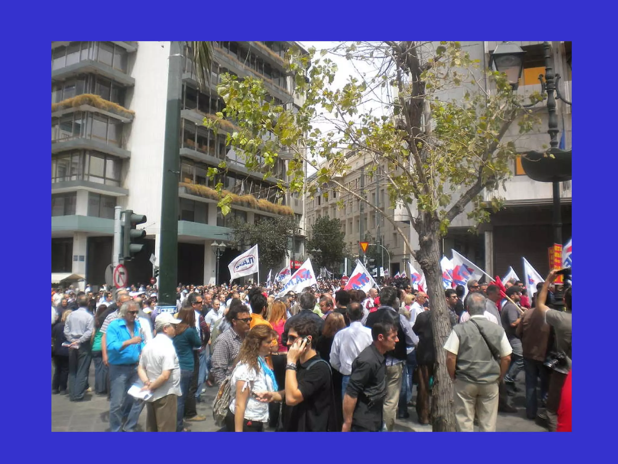 In May 2010, protests in Athens drew 200,000 participants, resulting in the tragic deaths of three workers in a fire at Marfin Bank amid demonstrations against government austerity measures. The ongoing protests reflect deep-seated discontent with capitalism in Greece. The document includes photos from the events.