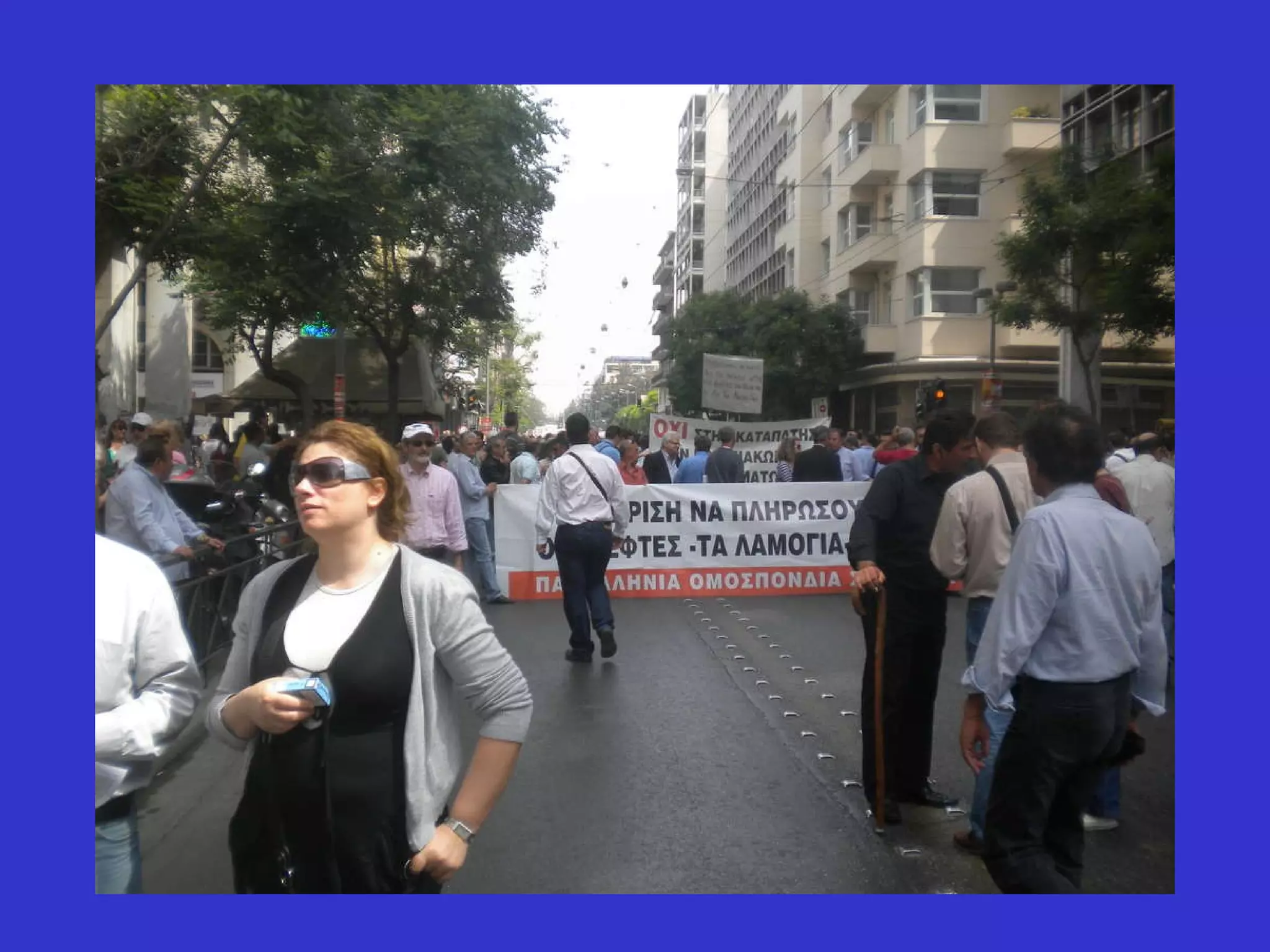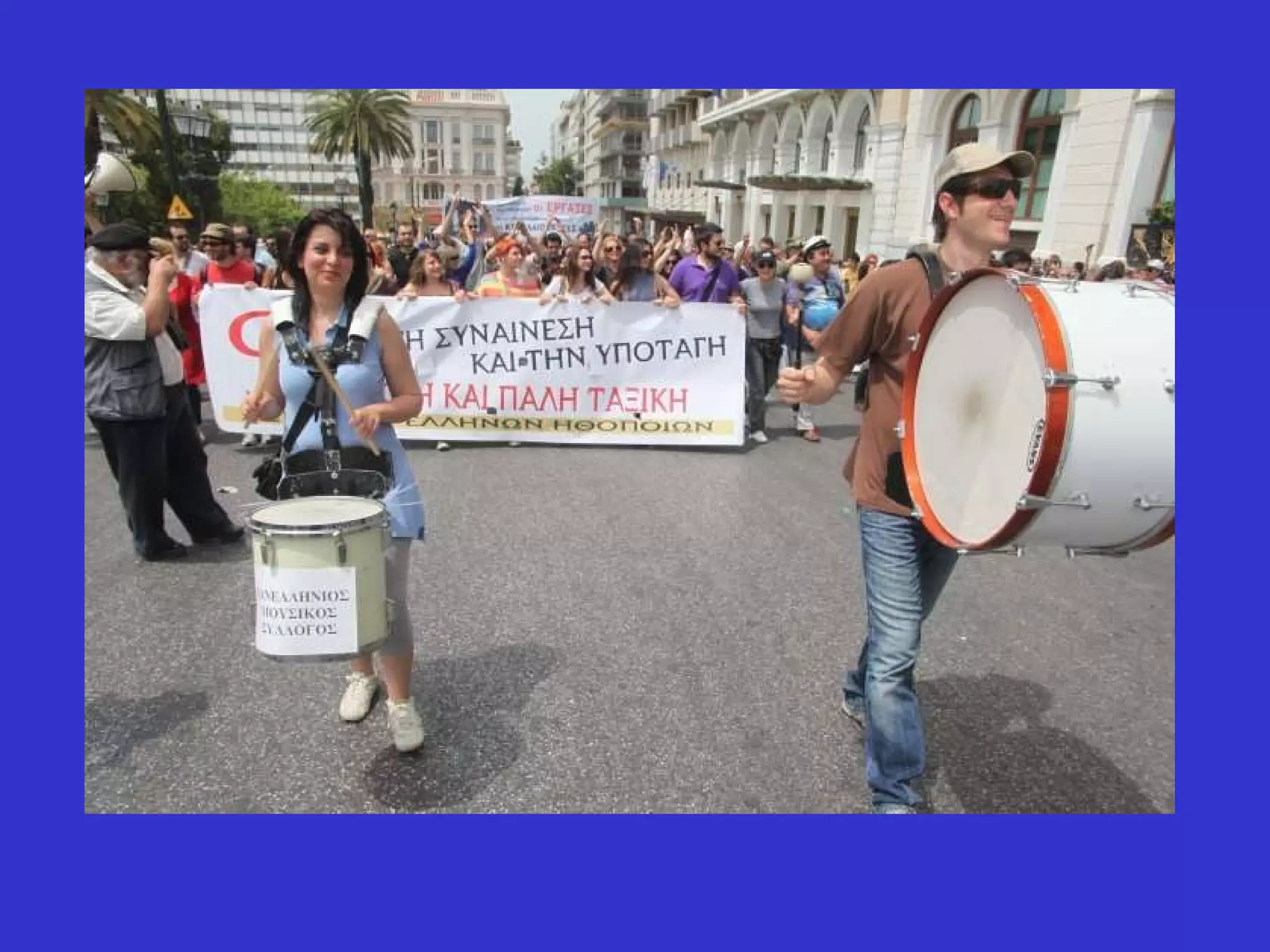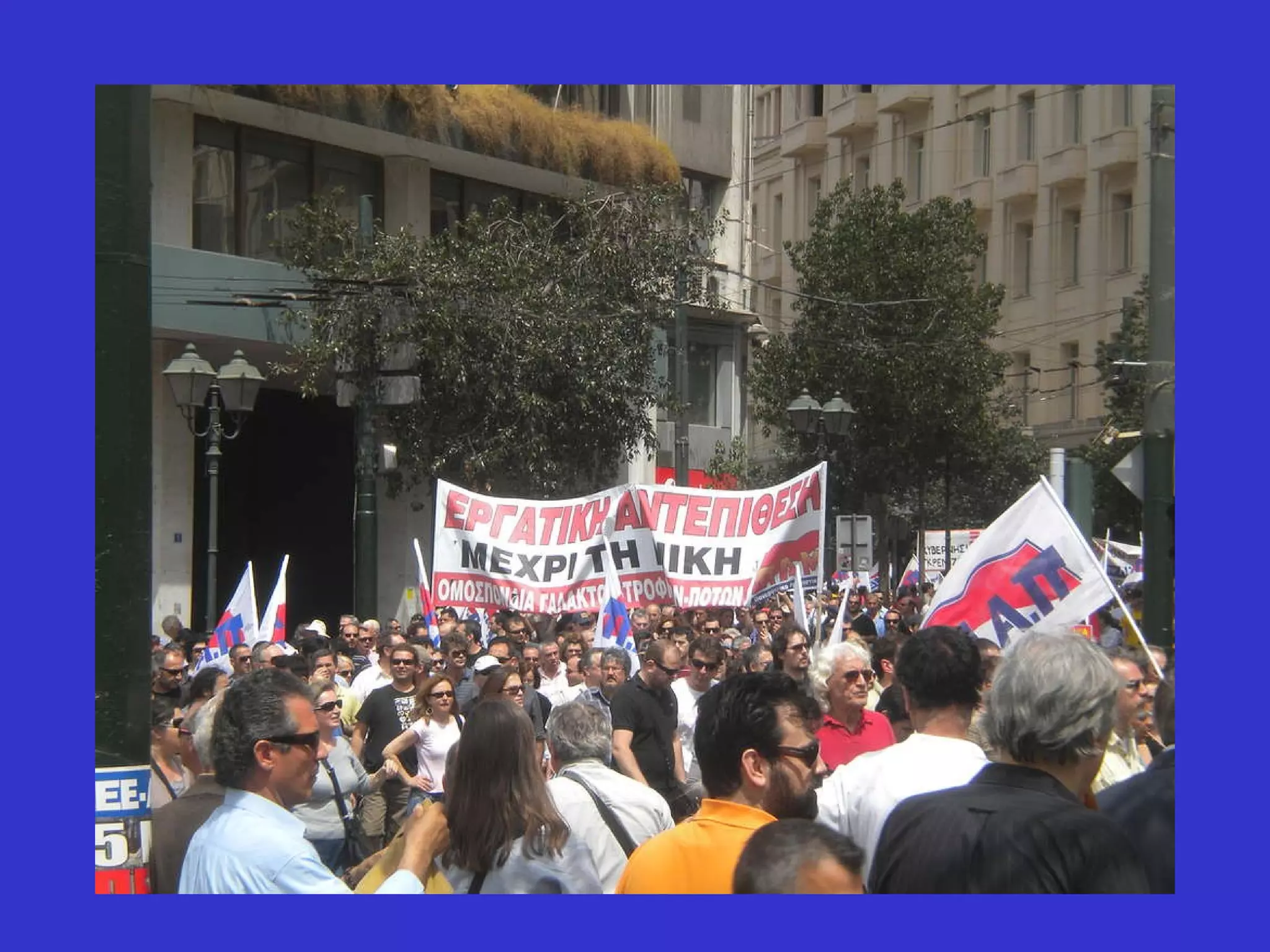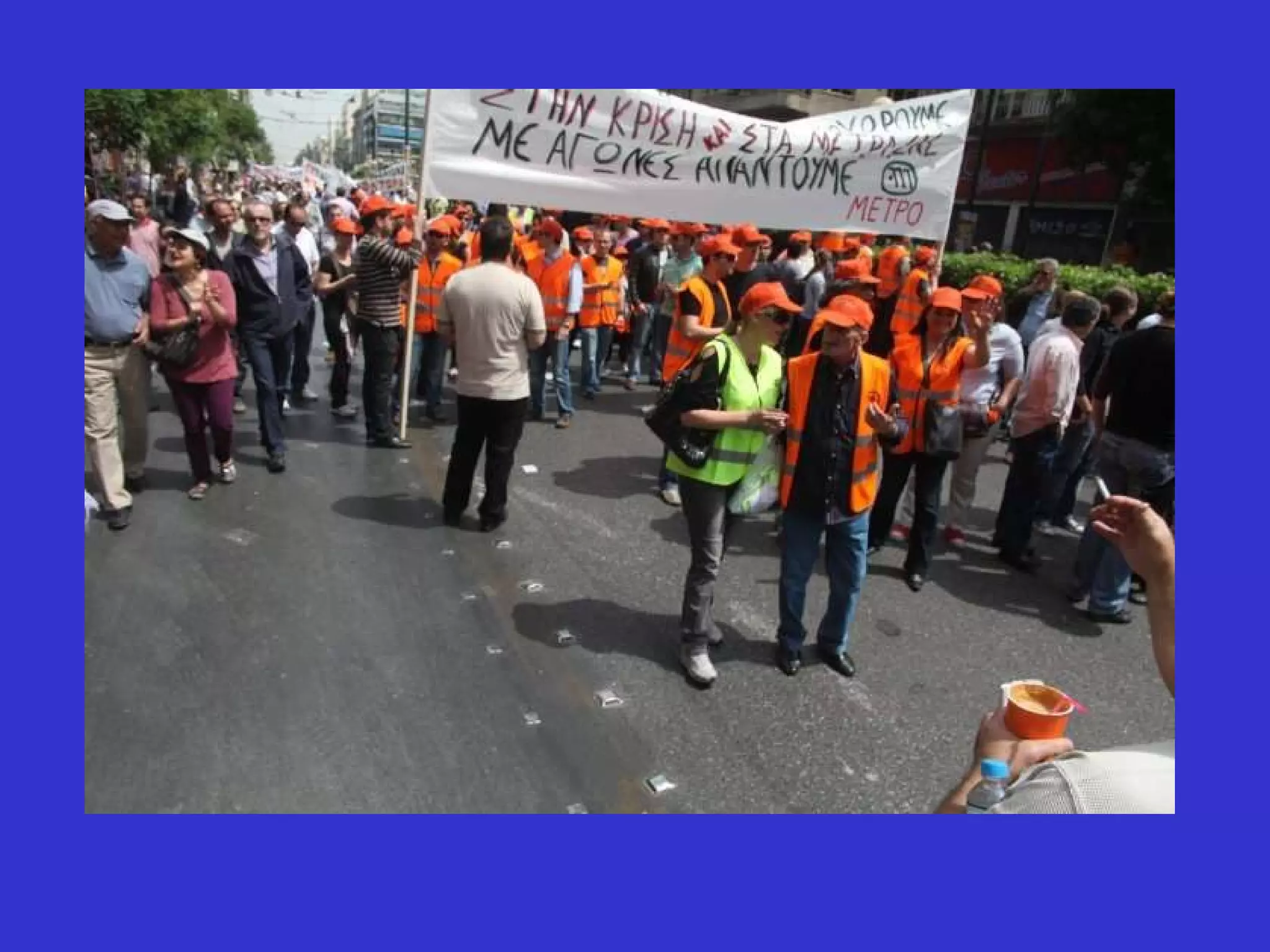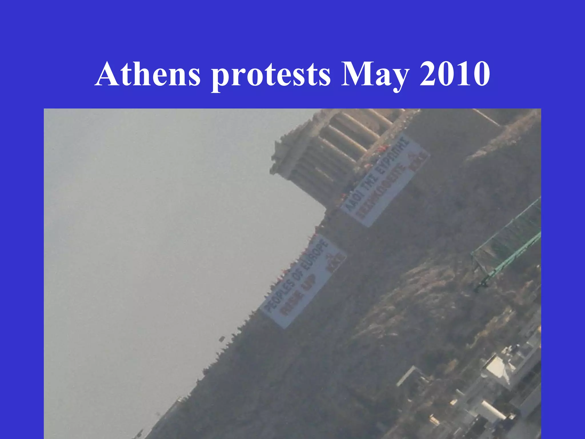 In May 2010, protests in Athens drew 200,000 participants, resulting in the tragic deaths of three workers in a fire at Marfin Bank amid demonstrations against government austerity measures. The ongoing protests reflect deep-seated discontent with capitalism in Greece. The document includes photos from the events.
