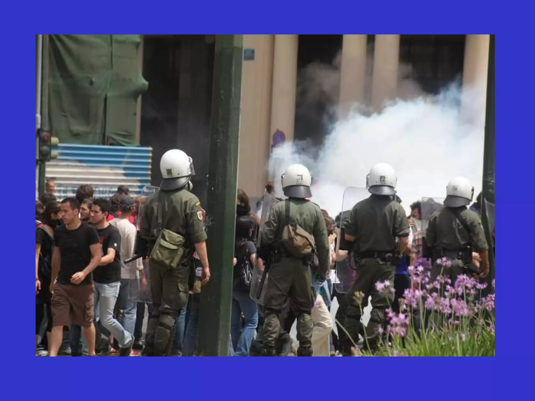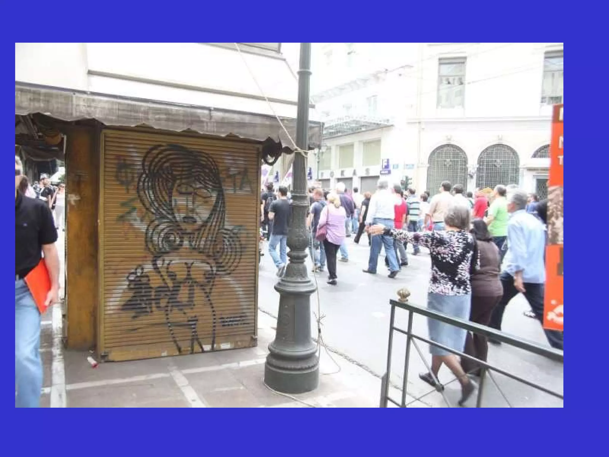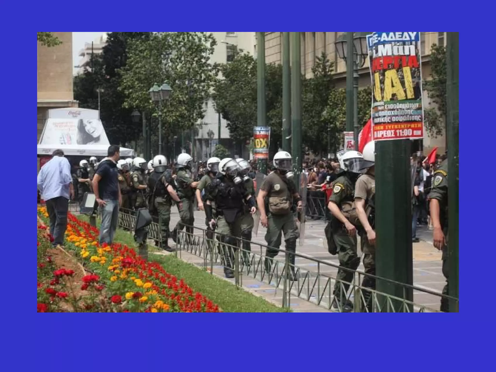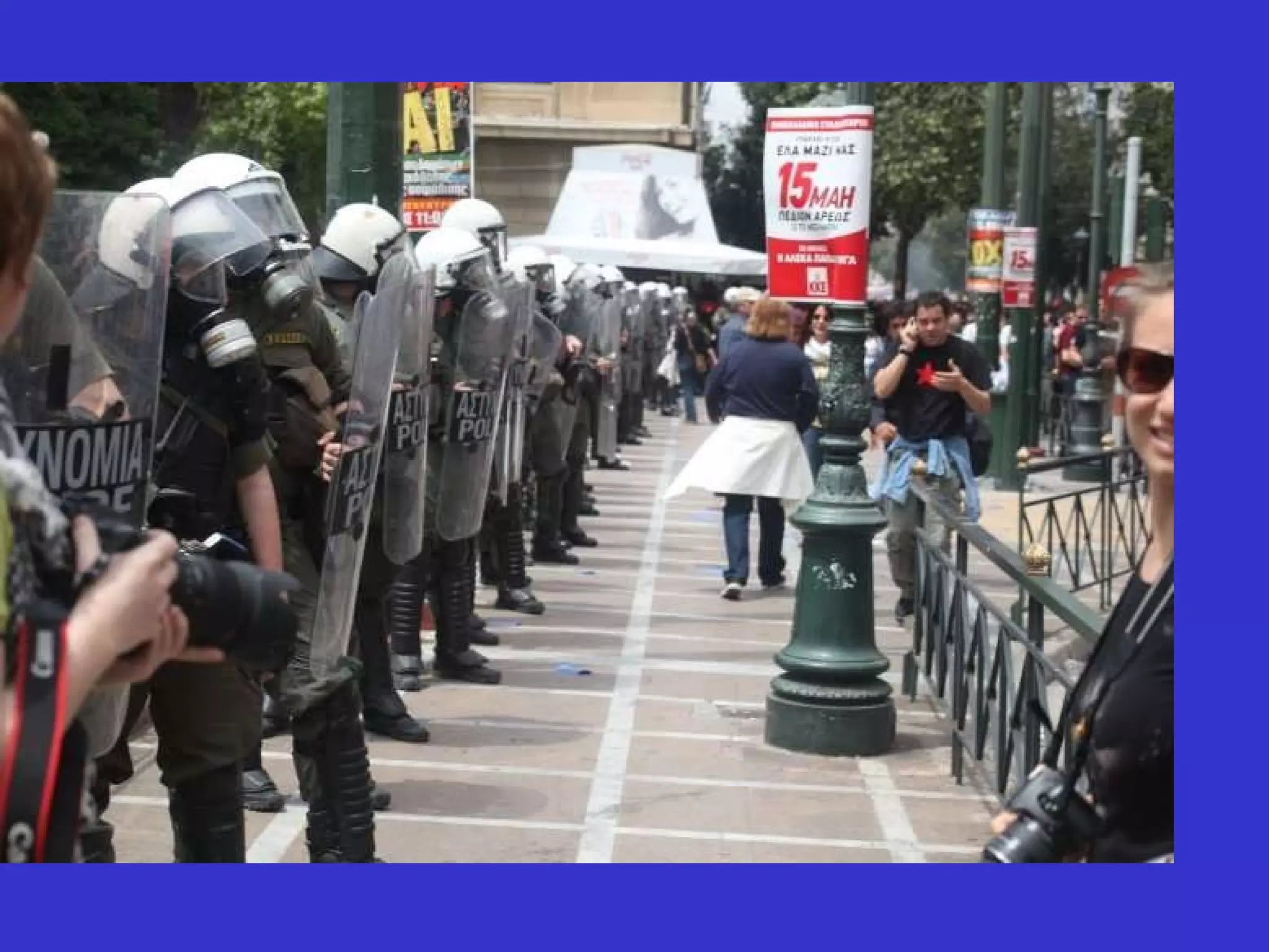 In May 2010, protests in Athens drew 200,000 participants, resulting in the tragic deaths of three workers in a fire at Marfin Bank amid demonstrations against government austerity measures. The ongoing protests reflect deep-seated discontent with capitalism in Greece. The document includes photos from the events.