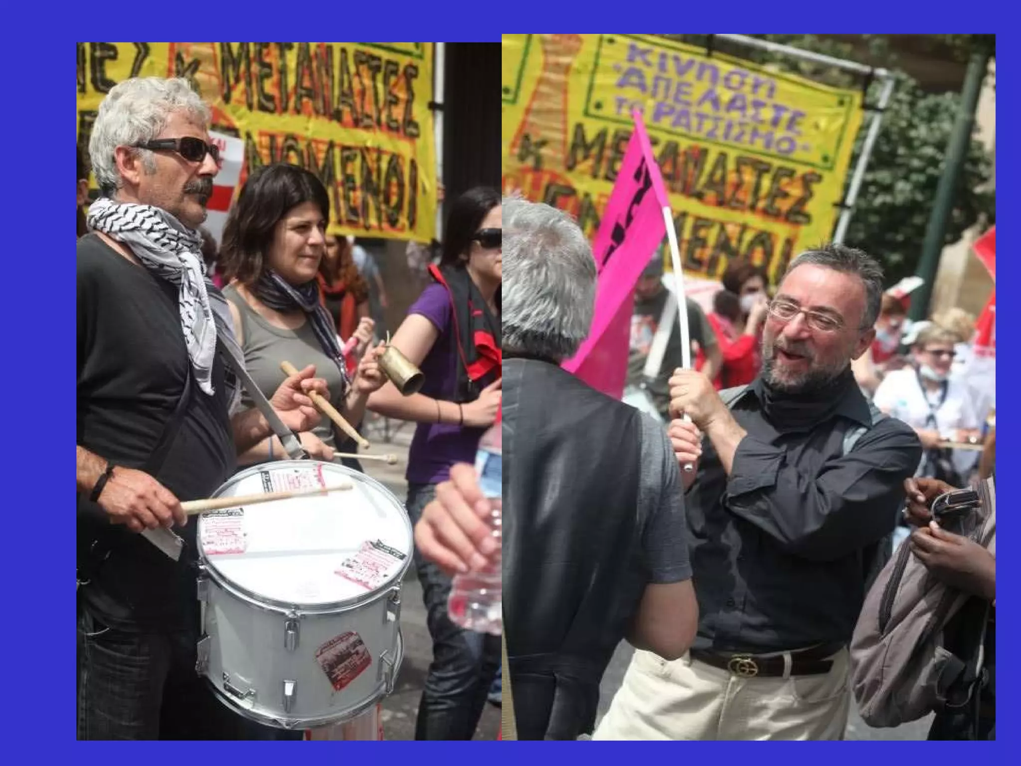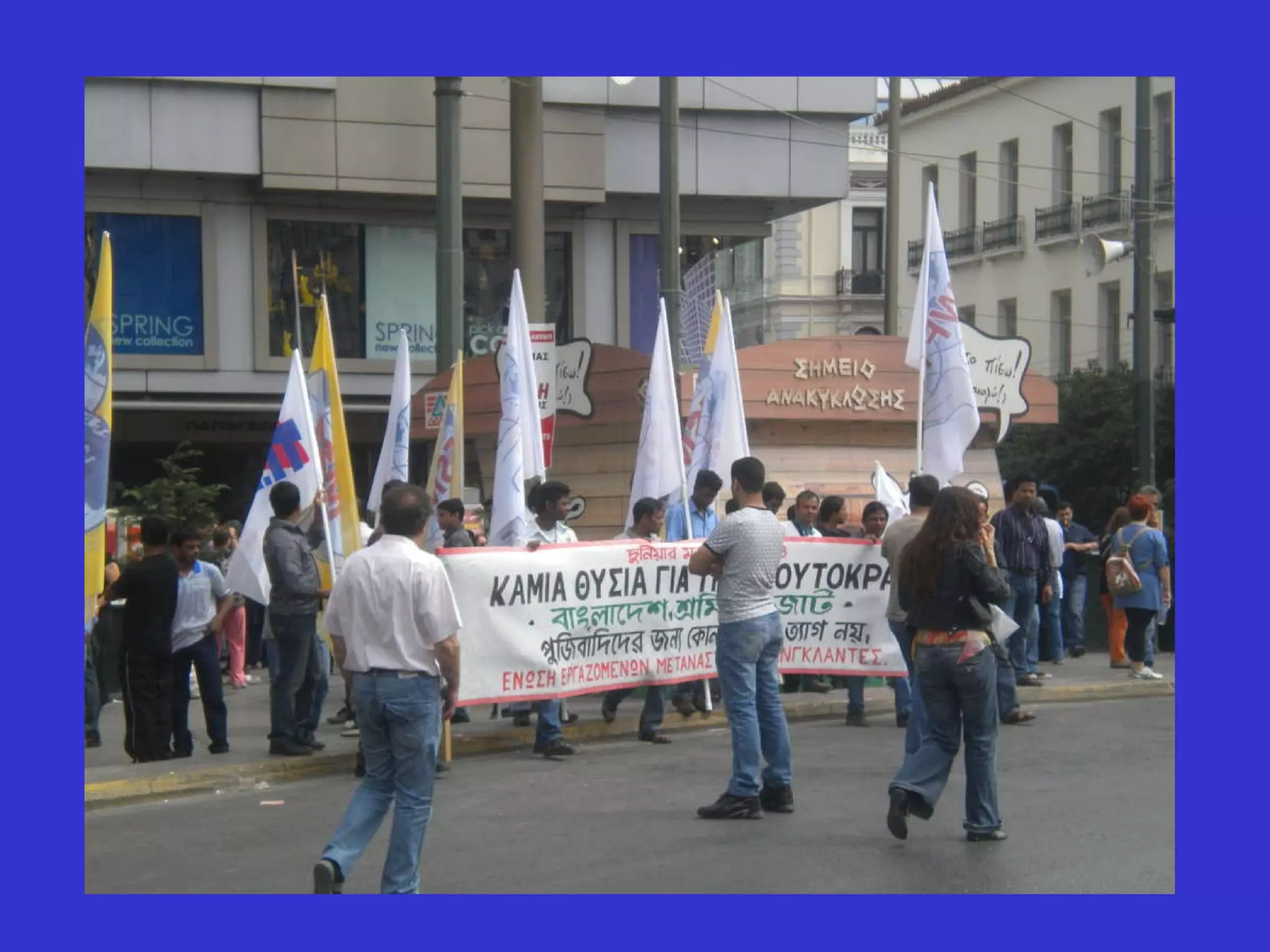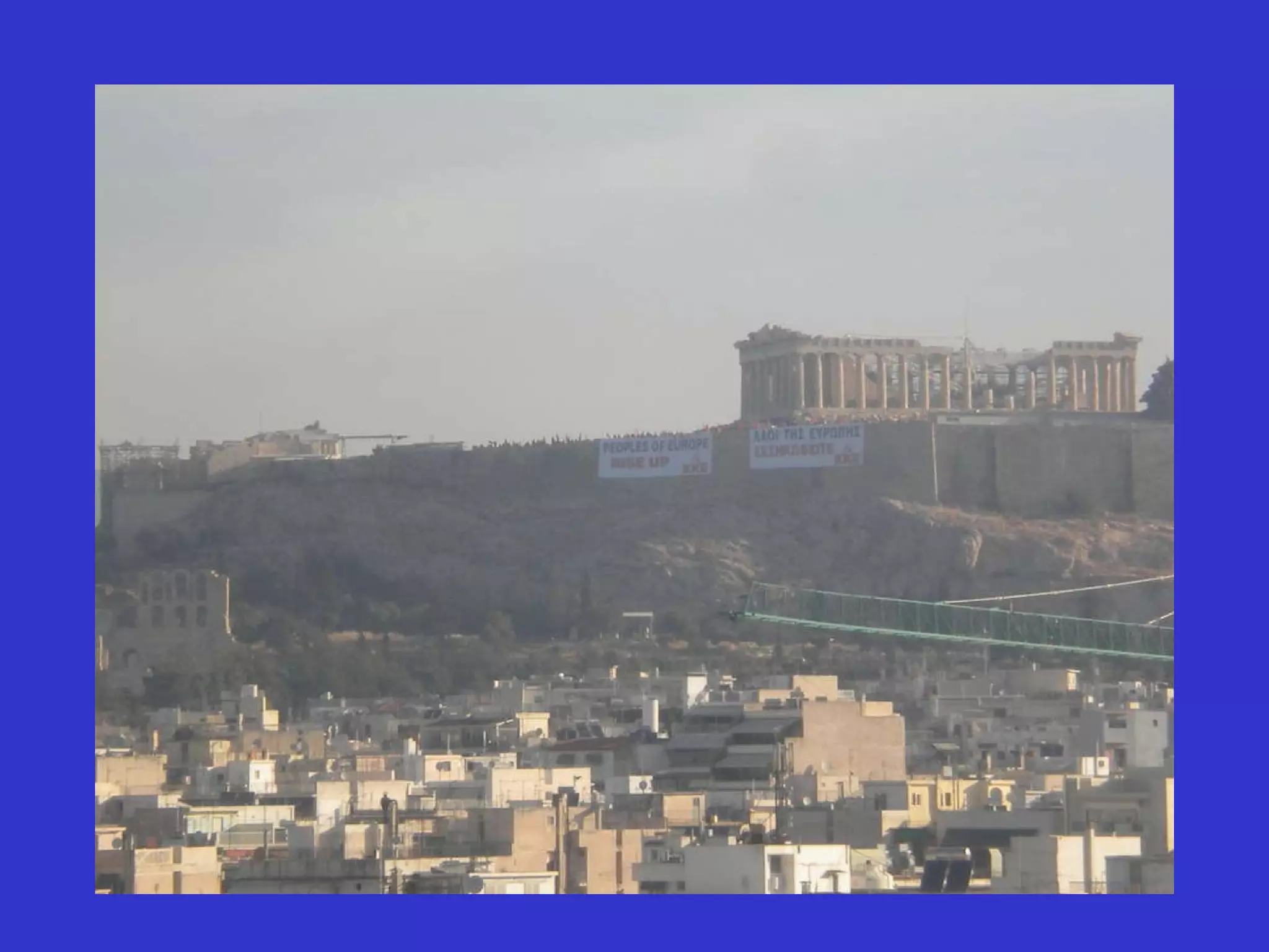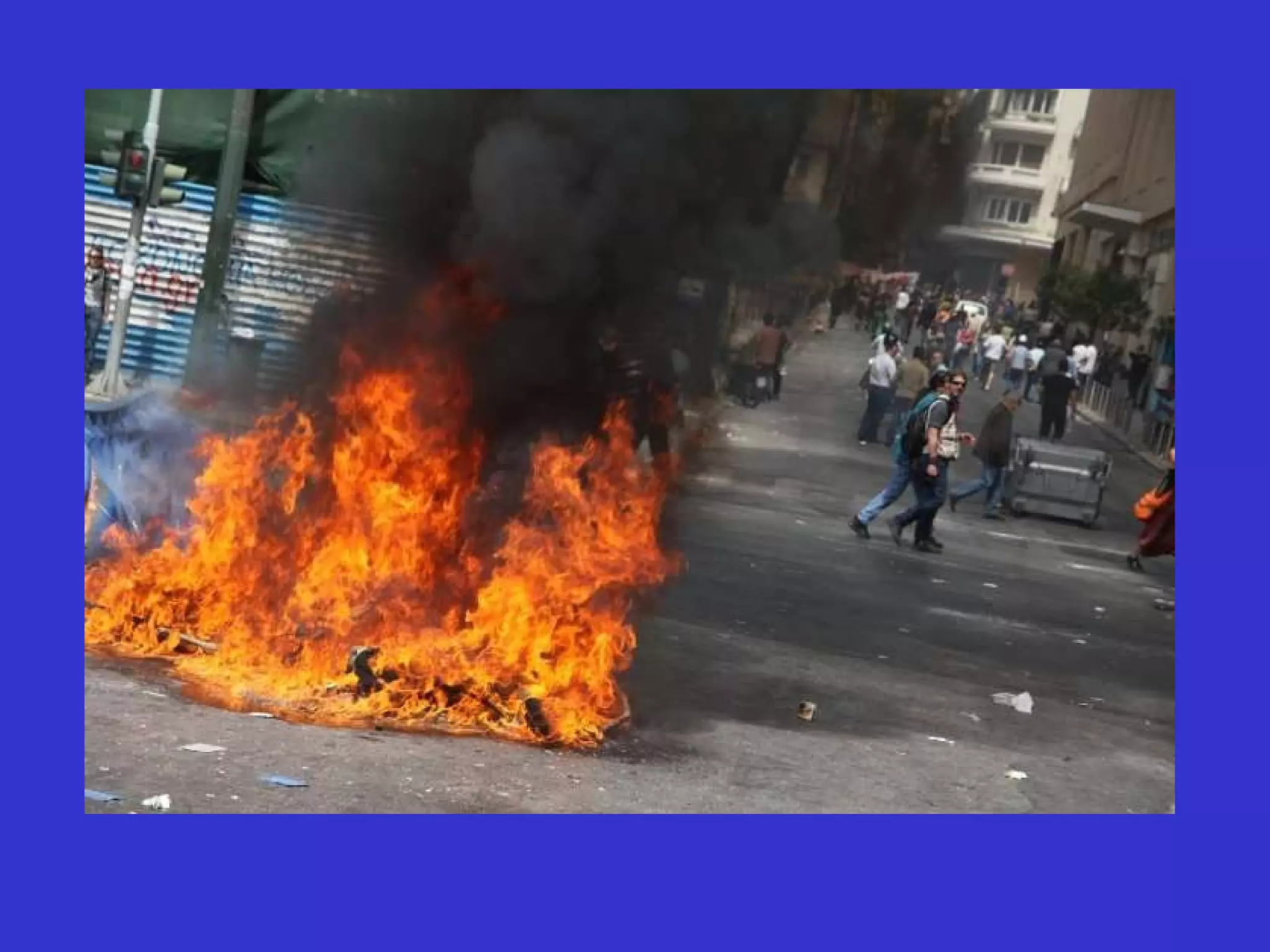 In May 2010, protests in Athens drew 200,000 participants, resulting in the tragic deaths of three workers in a fire at Marfin Bank amid demonstrations against government austerity measures. The ongoing protests reflect deep-seated discontent with capitalism in Greece. The document includes photos from the events.