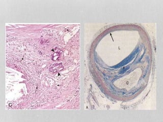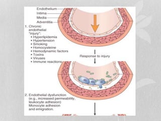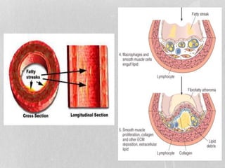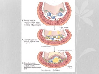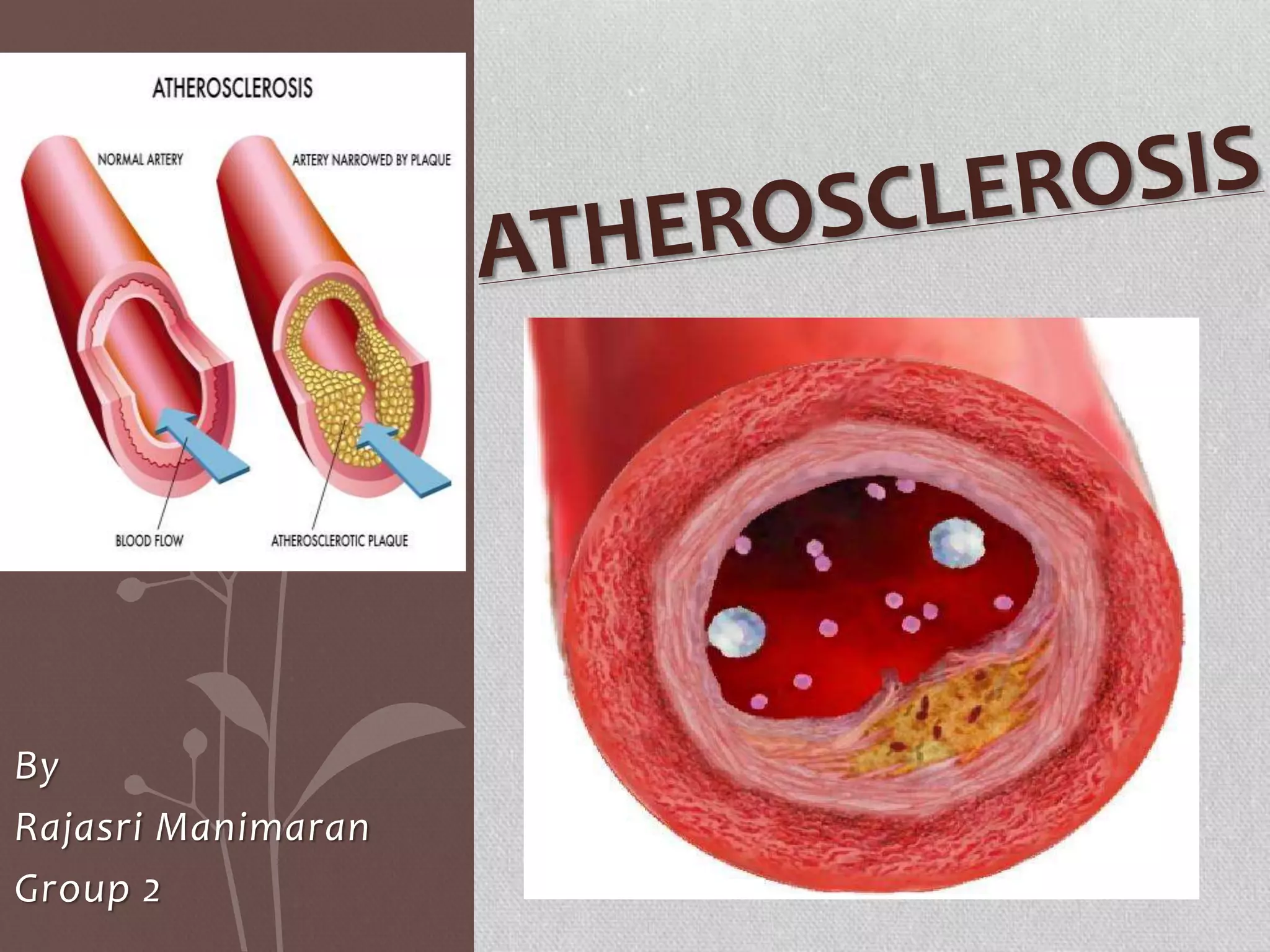 Arteriosclerosis occurs when arteries become thick and stiff due to a build-up of plaque, restricting blood flow. Atherosclerosis is a specific type involving a build-up of fats, cholesterol, and other substances in artery walls. It can affect arteries throughout the body, including those in the heart, legs, kidneys and brain. Symptoms vary depending on location but include chest pain, leg pain, fatigue and confusion. Risk factors include age, gender, family history, smoking, diabetes and high cholesterol. Treatment focuses on lifestyle changes and medications, while severe cases may require procedures like stenting or bypass surgery to improve blood flow.