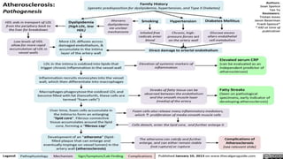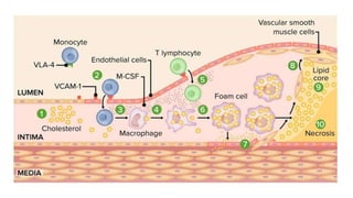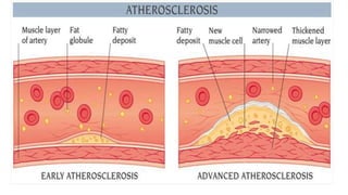 Atherosclerosis is a disease where plaque builds up in the arteries. Over time, the plaque hardens and narrows the arteries, limiting blood flow. Risk factors include age, family history, smoking, high blood pressure, high cholesterol, diabetes, and obesity. Complications arise when blood flow is reduced to organs like the heart, brain, kidneys, and limbs, potentially causing heart attacks, strokes, chronic kidney disease, or poor circulation. Treatment focuses on lifestyle changes and medications to control risk factors and symptoms.