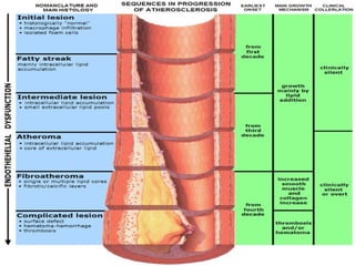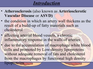 Atherosclerosis is a disease where plaque builds up inside arteries. It is caused by inflammation in the arteries due to risk factors like high cholesterol, high blood pressure, smoking, and diabetes. Over time, plaque hardens and narrows the arteries, reducing blood flow. This can lead to complications like heart attacks or strokes if a plaque ruptures. Doctors use tests like ultrasounds and angiograms to diagnose atherosclerosis and determine if the arteries are blocked. Treatment involves lifestyle changes and medications to control risk factors and blood pressure. In severe cases, procedures like angioplasty may be needed to open blocked arteries.