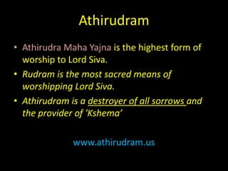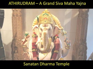 The document summarizes an 11-day Athirudram Maha Yajna event taking place from May 20-30, 2011 at the SanatanDharma Temple. Over 121 learned priests and scholars from India and the US will be conducting over 14,641 chants of Namakam and 1,331 chants of Chamakam over the 11 days. The event will include Rudra homams, Vasorddhara homams, purnahutis, krama archanas, lalita sahasranama archana, and other rituals, ceremonies, and spiritual discourses. Donations are encouraged to support the event.