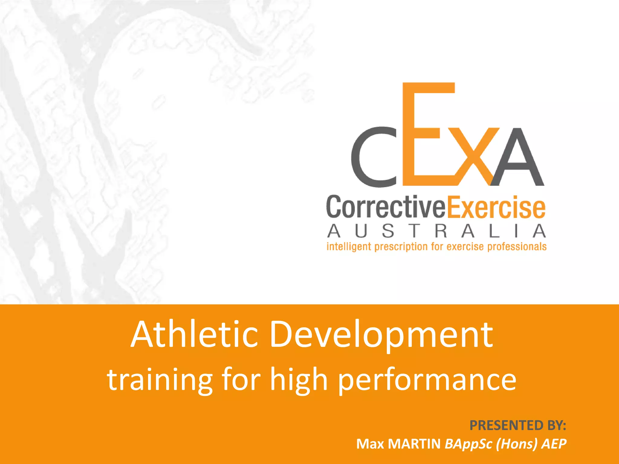 This document provides an overview of a training session on athletic development and corrective exercise. The session will address expectations, discuss foundational philosophies around training athletes versus sports, assess key movements, and prescribe exercises. It will cover assessing functional limitations, matching exercises to target movements like bending and rotation, and determining an athlete's training focus through assessment. The session aims to develop athletic qualities like jumping, acceleration/deceleration, and rotational control through corrective exercises.