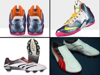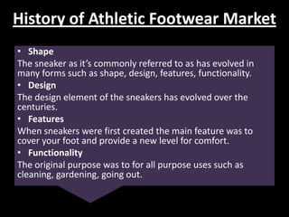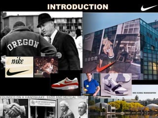 Nike is the world's largest athletic footwear and apparel company. It was founded in 1964 and has evolved from distributing Onitsuka Tiger shoes to becoming a global leader in designing and marketing athletic footwear, apparel, and equipment. Nike focuses on innovation through product research in areas like biomechanics and uses high-profile athlete endorsements and aggressive marketing to promote its brand. While Nike dominates the industry, it faces challenges from increasing competition and changing consumer preferences.